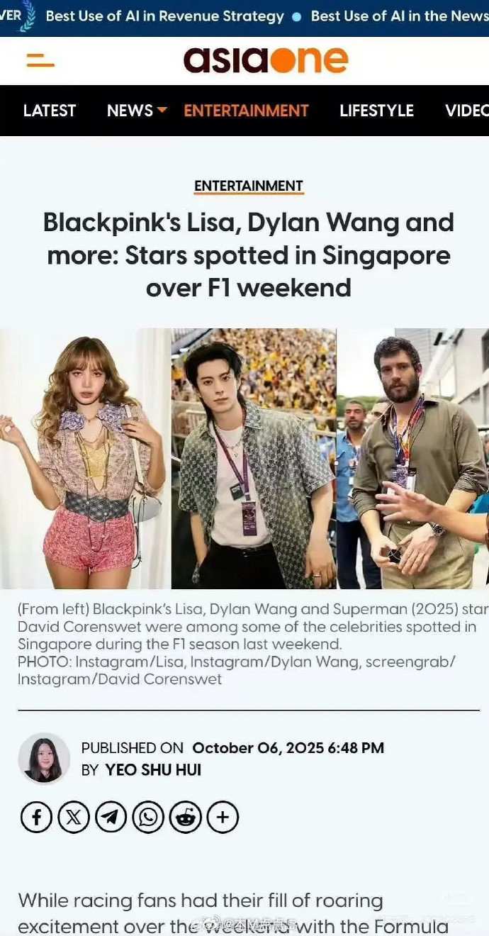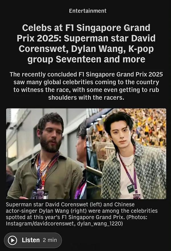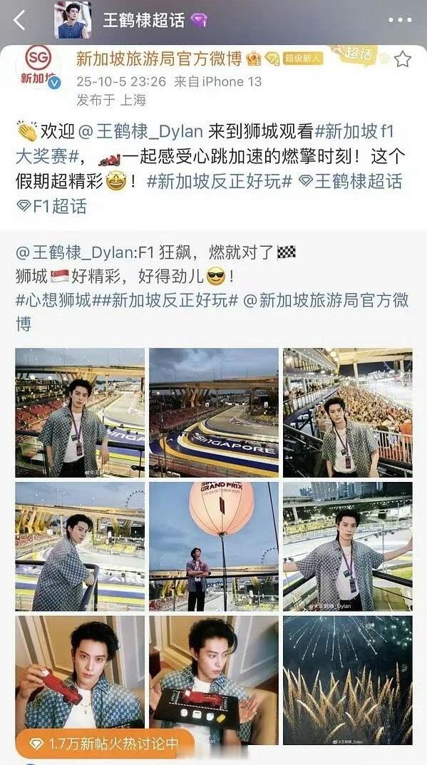 LV给品牌代言人王鹤棣的待遇好好,不仅作为LV品牌代言人,还是受新加坡政府主办方邀请前往新加坡F1观赛。新加坡主流媒体、东南亚顶级门户网站ASIA ONE报道标题【Blackpinks Lisa,Dylan Wang and more】靠自身影响力和商务资源出现在这种级别的海外活动里,被外媒当“国际明星”一样报道[耶] 新加坡主流媒体、东南亚顶级门户网站ASIA ONE报道标题都是国际巨星待遇