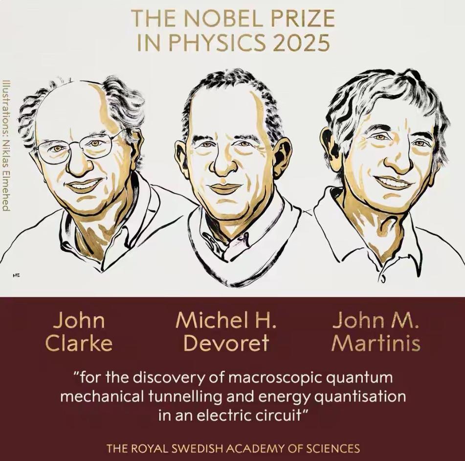 2025诺贝尔物理学奖出炉,3位美国科学家共享1100万瑞典克朗,约合846万人民币奖金+18K奖牌1枚、证书一份。 诺贝尔物理奖,世界公认的顶级奖项有了归属。诺贝尔1895年遗嘱而设立6个诺贝尔奖已出两个,其余(化学、经济学、文学、和平)奖项花落谁家? 瑞典皇家科学院7日宣布,将2025诺贝尔物理学奖授予,约翰•克拉克和米歇尔•H•德沃雷特、约翰•M•马蒂尼斯。 表彰他们在“电路中发现宏观量子力学隧穿和能量量子化”。