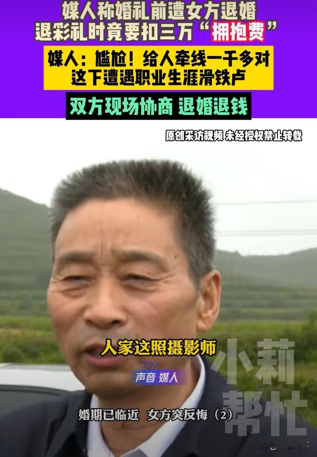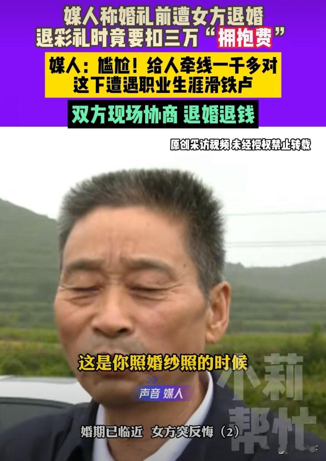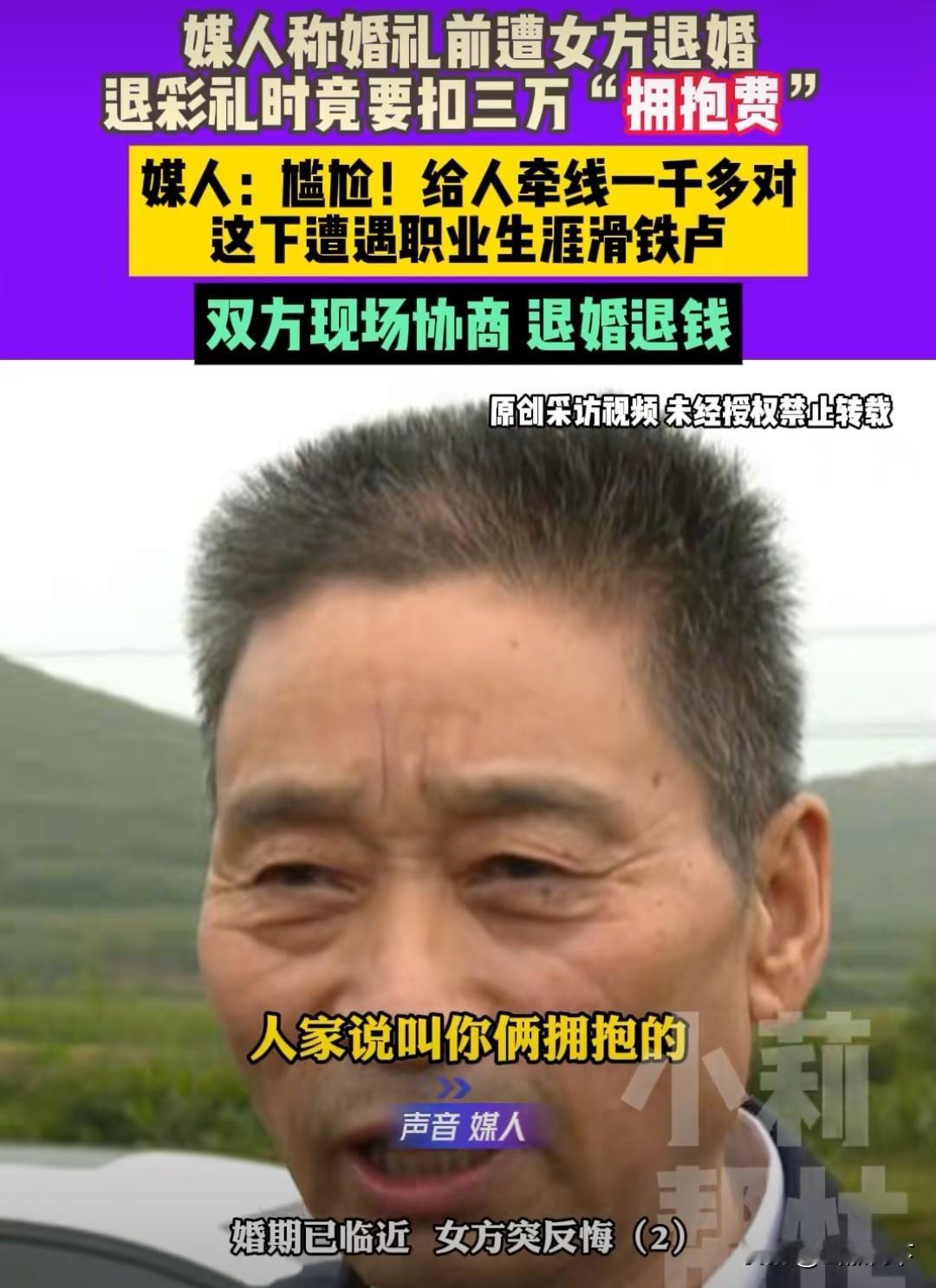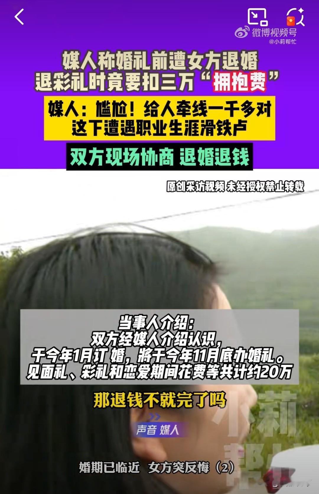 又一次被被小仙女刷新下限, 河南一男子去年经媒人介绍认识一个姑娘,相处后感觉还不错就确定了恋爱关系,今年1月份正式订婚,计划在11月29日举办婚礼,前前后后给了女方20万左右的彩礼以及四金,婚纱照也拍了,婚宴酒店也确定了,亲戚朋友都通知完了,可现在女方突然说不结婚了。 媒人说女方嫌男子太老实,工资太低,商量退钱时还得扣三万拥抱费!关键这拥抱还不是男的主动要求抱的,媒人说是拍婚纱照的时候,摄影师说抱一下,这男子真是无妄之灾了,这不是欺负老实人吗? 而女方则表示:只是不想和他结婚,没有啥矛盾。搞笑的是女方父亲说拥抱是孩子提的要求,所以要扣掉三万。目前,经过协商,双方达成一致,女方现场退还170500元现金。 估计女方实在是找不到克扣彩礼的由头了,只能硬拿啥拥抱费来顶了,还好男方没做啥事,要不然这二十万就剩三万了,自己悔婚还要扣人家三万块,太不要脸了,我都怀疑是不是专门来骗彩礼的,吃相属实难看[笑哭][笑哭][笑哭]情感 河南