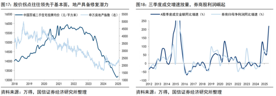 (1)地产板块,股价经历了5年的调整,目前估值已低。去年9/26中央政治局会议以来“稳住楼市股市”政策决心强大,目前房价尚未企稳,预计后续更多稳地产政策有望发力。历史经验显示股价通常领先基本面,上一轮地产指数高点在20/07,基本面则在一年后见顶。随着后续政策发力,低估的地产股或具备修复潜力。(2)券商板块,去年924以来股市行情回暖,成交明显放量,中报券商净利润同比已经回升至63%,25Q3A股成交金额同比增速高达218.54%,历史上牛市第二阶段日均成交额相比第一阶段往往放大,例如20/02-21/02日均成交额为9550亿元,较19/01-20/02的5764亿元明显放大。因此,随着本轮行情步入牛市第二阶段,市场成交额或进一步放大,券商利润有望提升;另外,其营收也有望受益于金融创新业务随之拓宽。(3)消费板块,以白酒为代表。白酒指数连跌5年,股息率回到4.2%处高位,性价比凸显。叠加股市行情回暖带动的居民财富效应,或推动低估消费板块上行。