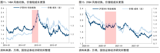 借鉴最近两轮牛市,牛市中期市场风格阶段性再平衡。随着基本面改善的扩散,牛市中期市场风格阶段性轮动,实现再平衡。2012/12-2015/06的牛市,牛市早期12/12-14/08,科技板块涨幅高达113.8%,大幅领先其他行业。进入牛市中期,14/09-14/12市场风格明显转向价值补涨,金融地产板块涨幅跃升至77.5%,超越科技成为阶段领涨主力。2019-21年的牛市,牛市初期科技领涨,牛市中期的前半段20/02-20/07,科技与消费领涨(涨幅分别为40.6%和50.5%),牛市中期的后半段20/10-21/02,科技甚至出现下跌(-5.9%),而周期和金融地产开始接力上涨,涨幅分别为19.9%和5.8%。可见,A股牛市中期存在典型的风格轮动规律,即行情往往先由科技、成长板块领涨,随后逐步扩散至金融、地产、周期等传统价值板块补涨。
