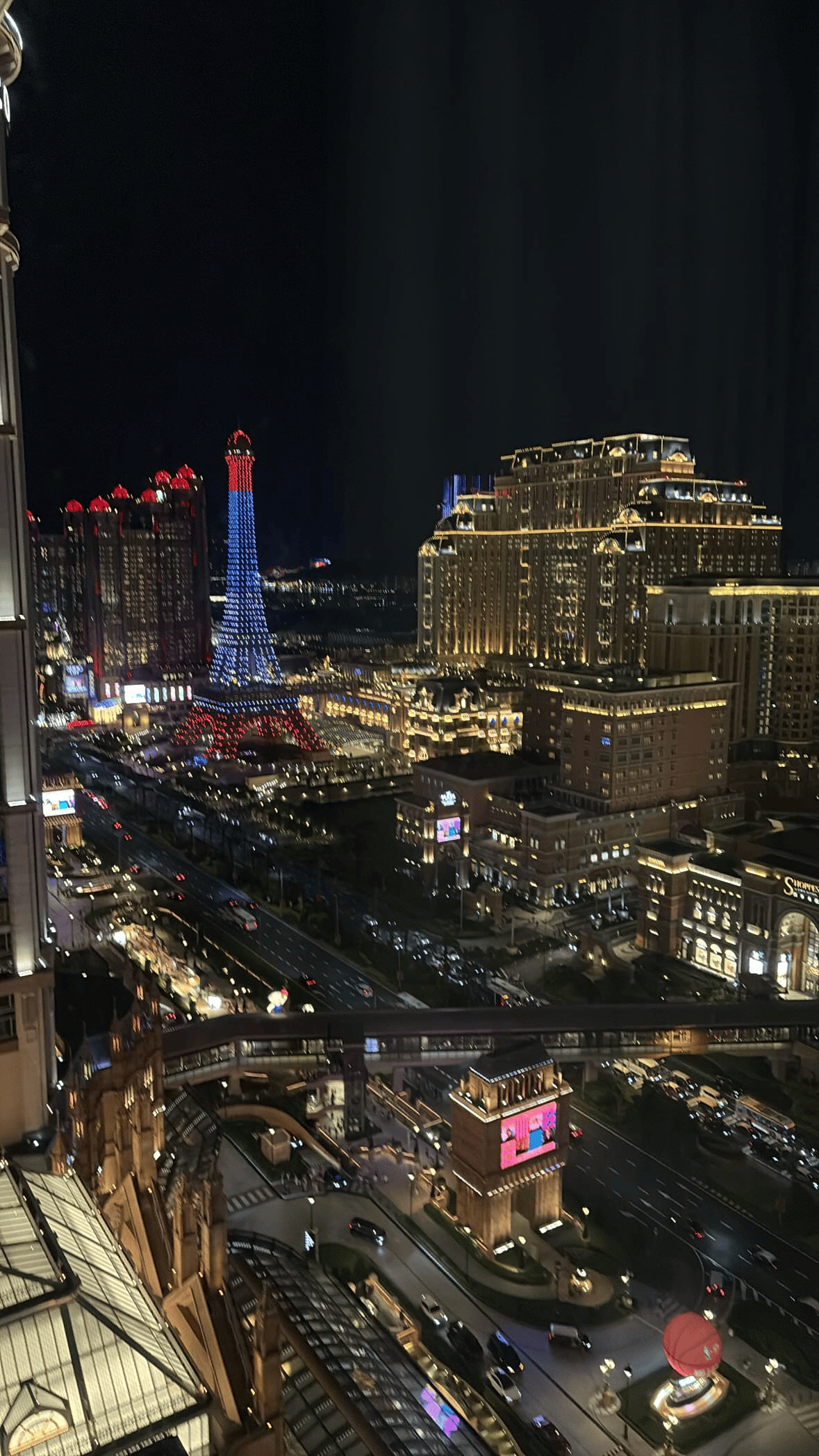 图中为狄龙从酒店窗外拍摄的澳门路氹金光大道区域的夜景,包含威尼斯人、巴黎人等标志性度假酒店建筑。