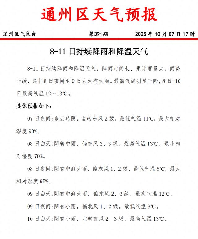 明天(8日)白天:阴转中雨,偏东风2、3级,最高气温13℃。