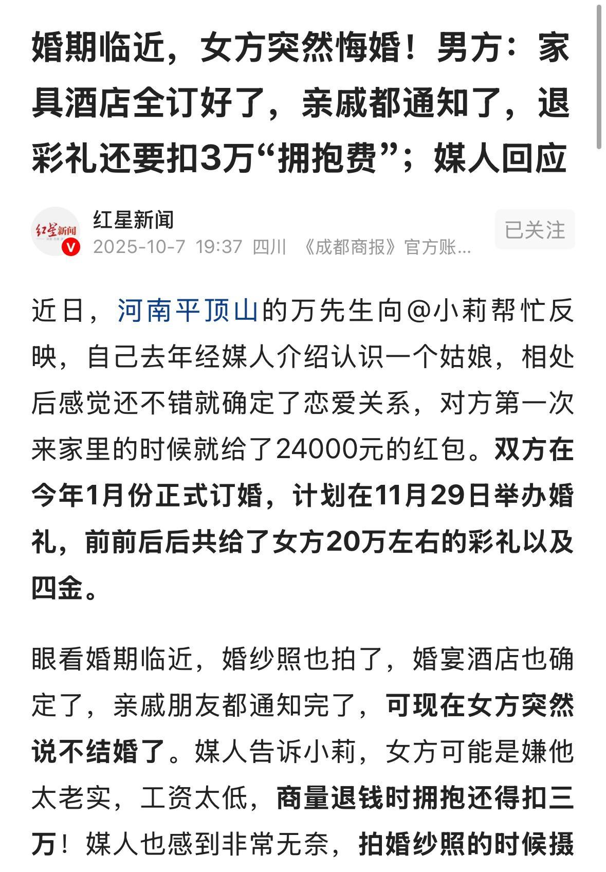河南平顶山,男子经媒人介绍定门亲,给了20万彩礼以及四金。临近婚期女方却突然说不不想结婚了,只愿退还17万,要扣掉3万拥抱费。因在拍摄婚纱照时需要拍一张拥抱照片,摄影师让俩人拥抱了,女方可能觉得吃亏了。最终双方协商达成一致,退钱退婚。 万先生在2024年找媒人帮忙说亲,毕竟老大不小了,家里也很着急,而且年龄越大越不好结婚,想着尽快了却父母的一桩心事。 万先生找的可是撮合过1000多对的70多岁的老媒人,经验丰富,肯定能帮万先生寻一门好亲事。 经媒人介绍,万先生结识了一个女孩,两个人相处下来感觉还不错,就确定了恋爱关系。 恋爱关系确定下来,接下来就应该是走结婚的流程了,所以万先生就把女孩带回家见了父母,让父母也看看满不满意。 女方来到万先生的家,万先生的父母准备了一沓厚厚的红包,足足有24000元。万家是认可这个儿媳妇的,所以才准备了这么厚重的红包以示重视。 在2025年1月份,双方正式订婚,约定好11月末举办婚礼。订婚后,万先生就带着女方去购置四金,再给彩礼,前前后后共计给了20万左右。 自从订婚后,万先生家就一直在忙碌着,订酒店,找婚庆,还早早就让万先生和女方把婚纱照拍了。 就在一切都准备的差不多,就等着时间举办婚礼了,女方家却突然提出不想结婚了。 万先生找到女方询问究竟,问不出来个所以然,只能让媒人上门讨要一个说法,要是什么地方做的不到位不满意的,两家人可以坐下来商议,不用闹到不结婚的地步。 可媒人从女方家回来后,万家就知道这婚事是结不成了。女方可能是嫌弃万先生的工资太低,为人太老实,所以才想要悔婚。 万先生之所以一直都没有结婚,也跟这些有很大关系,要不然万家也不会拿出20万彩礼为儿子张罗婚事。 既然不能结婚,那就应该退还彩礼钱,但是女方家却只愿退还17万的彩礼,要扣掉3万的拥抱费。 何为拥抱费?其实就是在拍摄婚纱照的时候,万先生应摄像师的要求,抱过女方,女方可能是觉得吃亏了,所以要求扣掉3万的拥抱费。 媒人越说越没有底气,因为媒人都觉得尴尬。撮合过1000多对,头一次听说要给拥抱费的,简直是不合情理。 男方家听完后十分生气,冲到女方家门前要个说法。女方表示两个人并没有矛盾,只是不想和万先生结婚。 而对于3万元的拥抱费,女方父亲表示确有其事,而且是女方自己要求的。 男方家的请柬都发出去了,这荒唐的退婚理由和不退还全部彩礼的情况,他们也是没遇到过,但事情还是不应闹大,于是双方就坐下来协商。 经过双方协商达成一致,女方现场退还了170500元现金,这场婚事就算退了。 根据《民法典》第1046条的规定:结婚应当男女双方完全自愿,禁止任何一方对另一方加以强迫,禁止任何组织或者个人加以干涉。 万先生和女方的婚事虽然是经过媒人撮合的,但也是经过万先生和女方两个人同意的,属于完全自愿的。 即便是女方悔婚,也是女方的自由,因为婚姻自由,任何人都不能强迫或干涉两个人结合。 既然女方提出了悔婚,那么就应该退还万先生家给的20万的彩礼。 根据《最高法关于适用《民法典》婚姻家庭编的解释(一)》第5条的规定:当事人请求返还按照习俗给付的彩礼的,如果查明属于以下情形,人民法院应当予以支持: (一)双方未办理结婚登记手续; (二)双方办理结婚登记手续但确未共同生活; (三)婚前给付并导致给付人生活困难。 适用前款第二项、第三项的规定,应当以双方离婚为条件。 万先生和女方只是订婚并未举办婚礼,而且双方也只是介于交往的阶段,并未共同生活。 在女方家提出悔婚后,按照规定女方家应退还全部彩礼,而不是扣除3万元的拥抱费,扣除费用的理由过于牵强且没有任何的法律依据。 按照女方家表示,拥抱对于女方造成了一定程度上的吃亏,那么女方可以寻求其他渠道向万先生家索要精神损害赔偿。 根据《民法典》第1183条的规定:侵害自然人人身权益造成严重精神损害的,被侵权人有权请求精神损害赔偿。 因故意或者重大过失侵害自然人具有人身意义的特定物造成严重精神损害的,被侵权人有权请求精神损害赔偿。 女方觉得跟万先生拍摄婚纱照时被抱了一下是损失,那就应该起诉万先生对女方造成了人身权益的侵害,以此产生了精神上的损害,要求万先生家赔偿。 而不是用扣除3万元彩礼来代替,这样的方式和方法没有法理依据,站不住脚跟。 万先生也可以起诉女方家退还全部彩礼,应该是很有胜算的,只不过要耗费精力和时间来打官司,可能对于万先生家而言不是最好的解决办法。 高昂的彩礼钱,还是横在年轻男女结婚前的一道沟。想要顺利结婚,不仅要有经济实力,还得提防着,要不然就很可能赔了夫人又折兵。#女方悔婚退彩礼时要扣3万拥抱费#