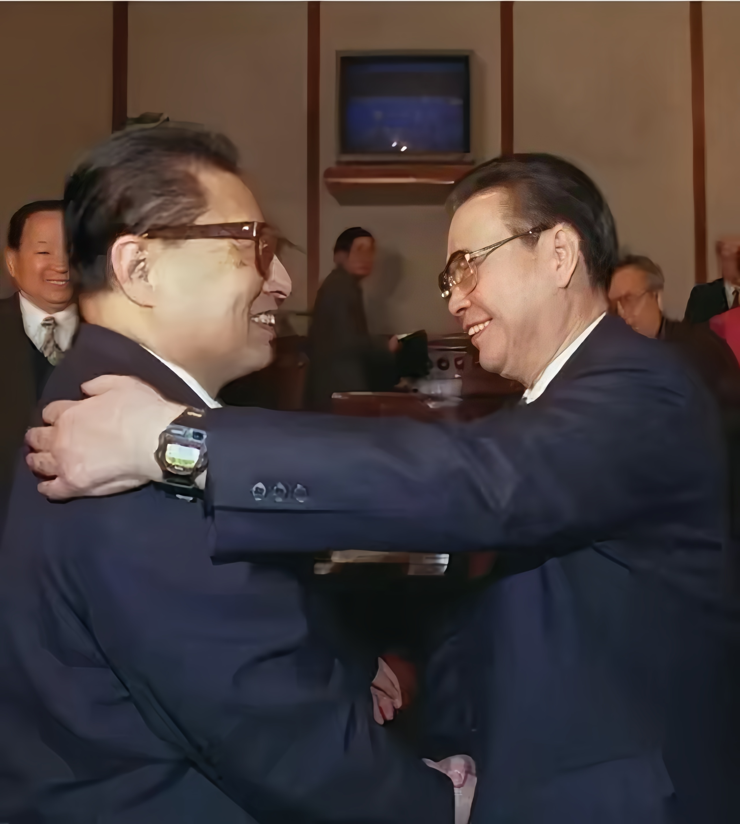 1998年九届全国人大会议召开,选出了新的委员长。这是两位委员长热情握手交接的情形。左边是乔石,他是前任委员长,右边是李鹏,他是新当选的委员长。两位委员长都已经逝世,而且都非常高寿,都活了90多岁。