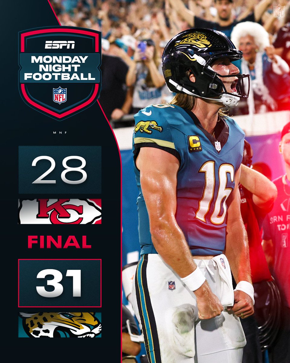NFL官方X账号发推特报道,决赛:美洲虎队在周一橄榄球之夜惊险获胜后战绩提升至4胜1负!