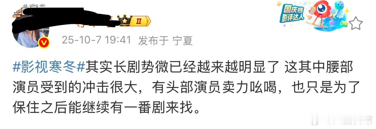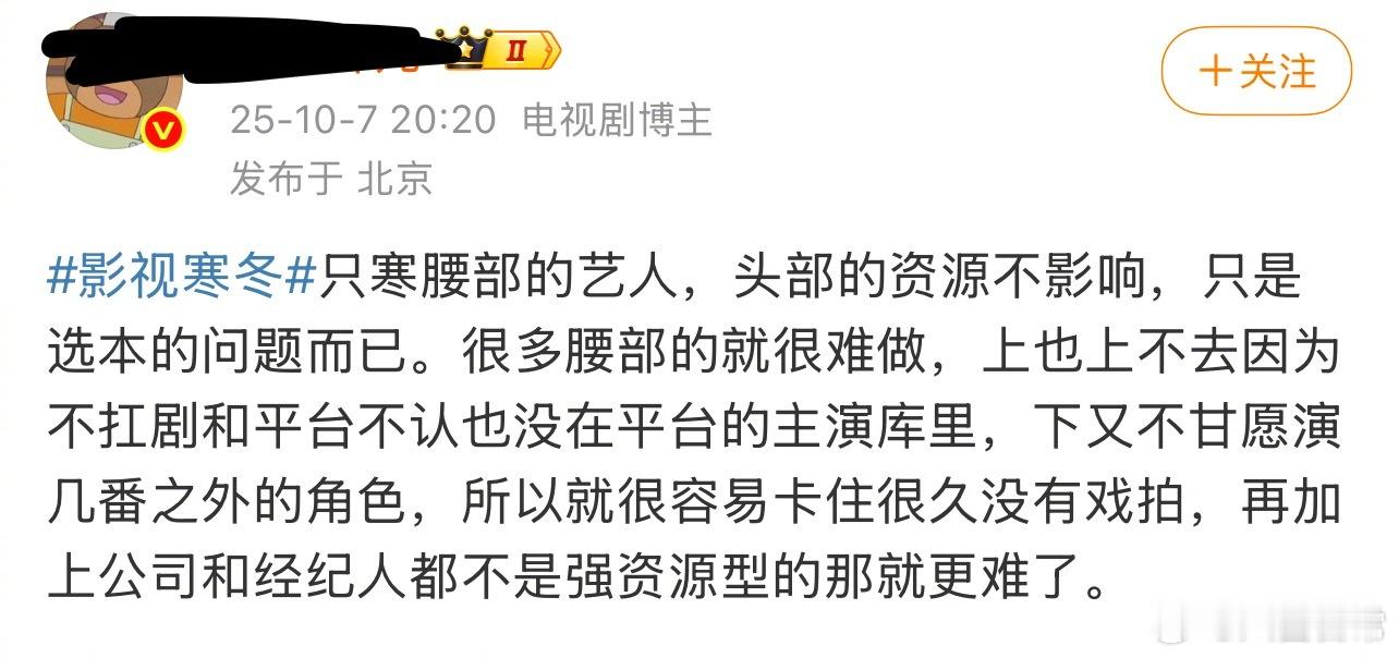 说是影视寒冬只寒腰部艺人,头部艺人不受影响影视寒冬腰部艺人失业