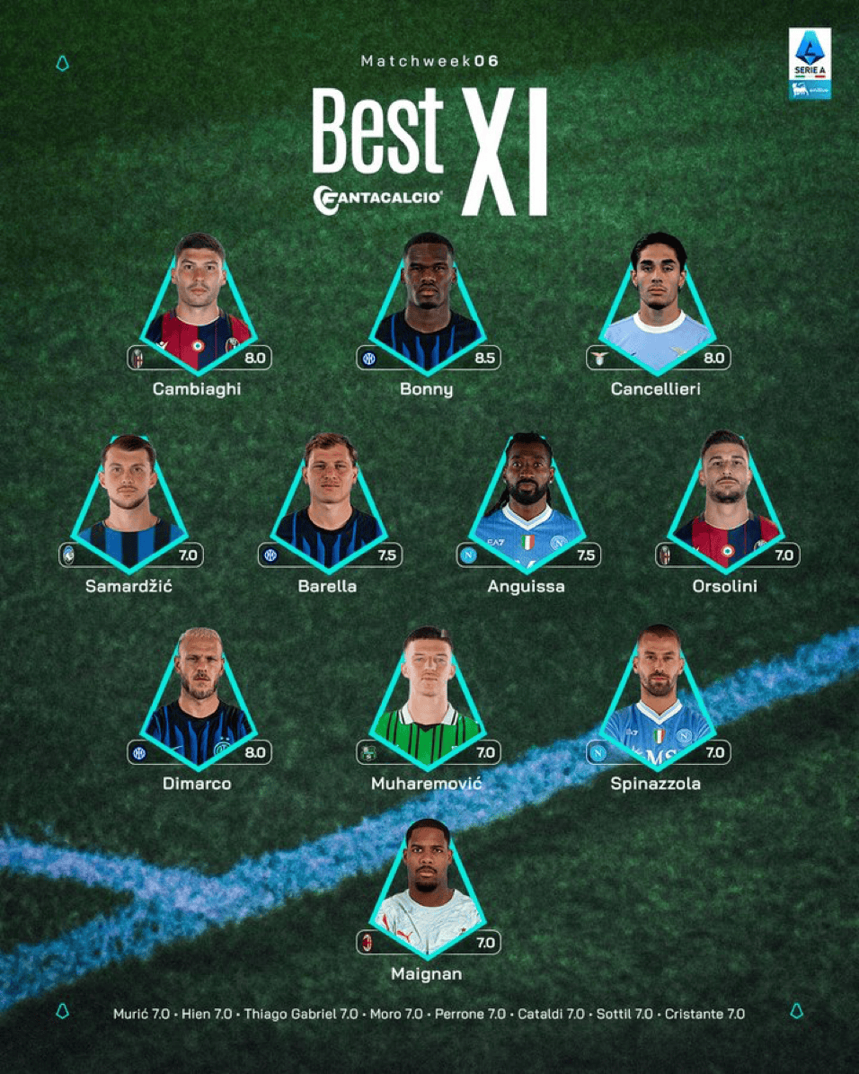 中场:萨马尔季奇(亚特兰大)、巴雷拉(国际米兰)、安古伊萨(那不勒斯)、奥尔索里尼(博洛尼亚)