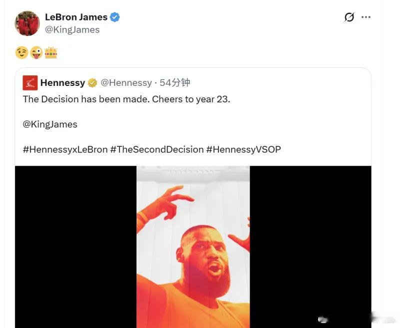 轩尼诗官方账号配文:"决定已做出,为第23年干杯。"