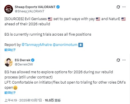 "EG将在2026年重建前与yay和NaturE分道扬镳,队伍目前正在对五个位置进行试训。"