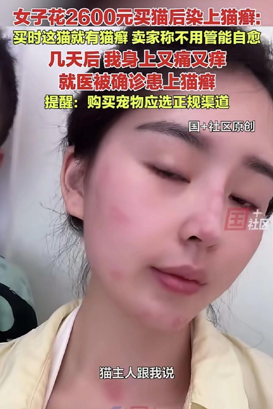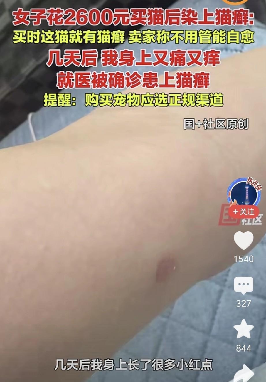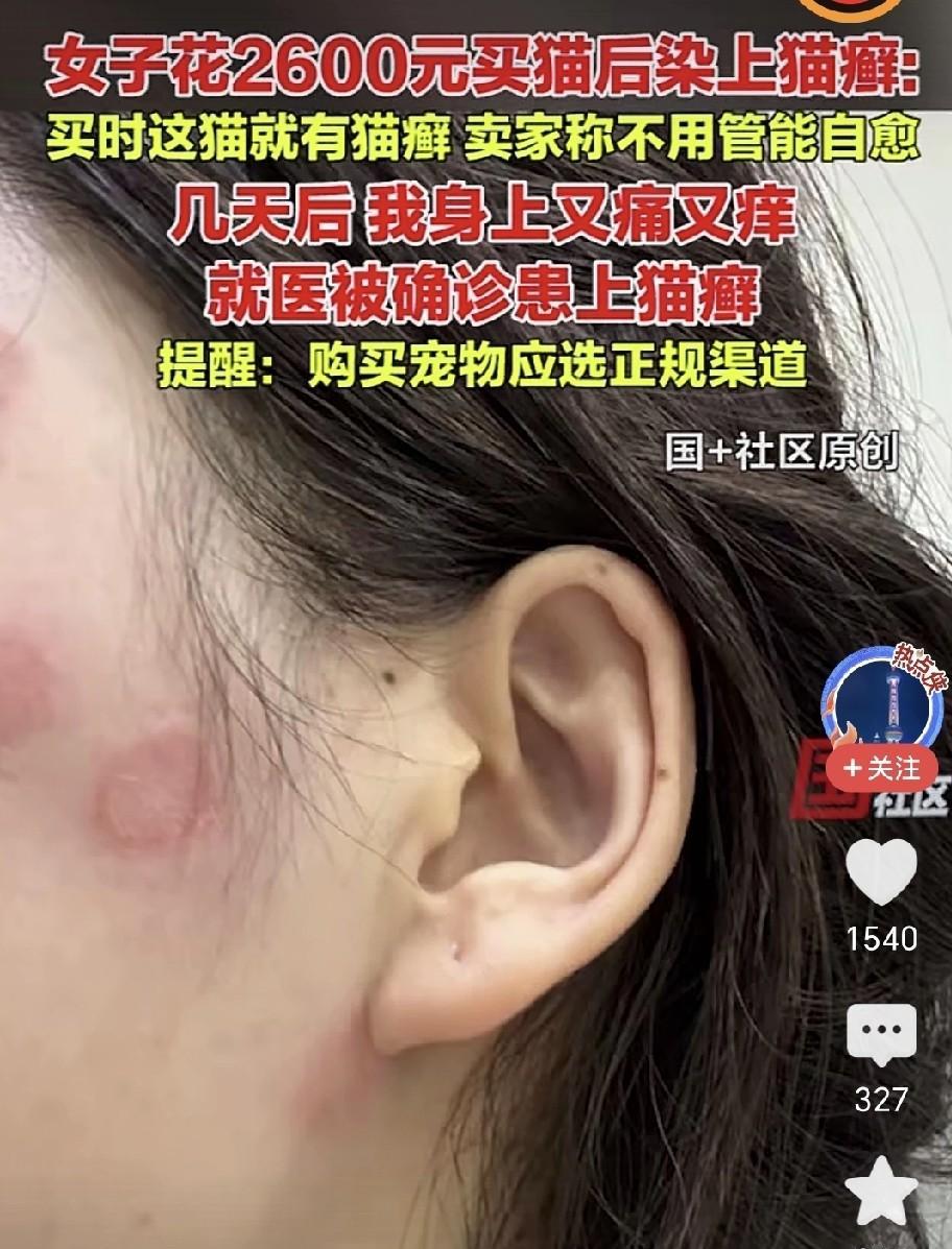 女子发布视频称自己被猫癣传染了。原来,女子买猫时,猫就已经患有猫癣,商家表示不用