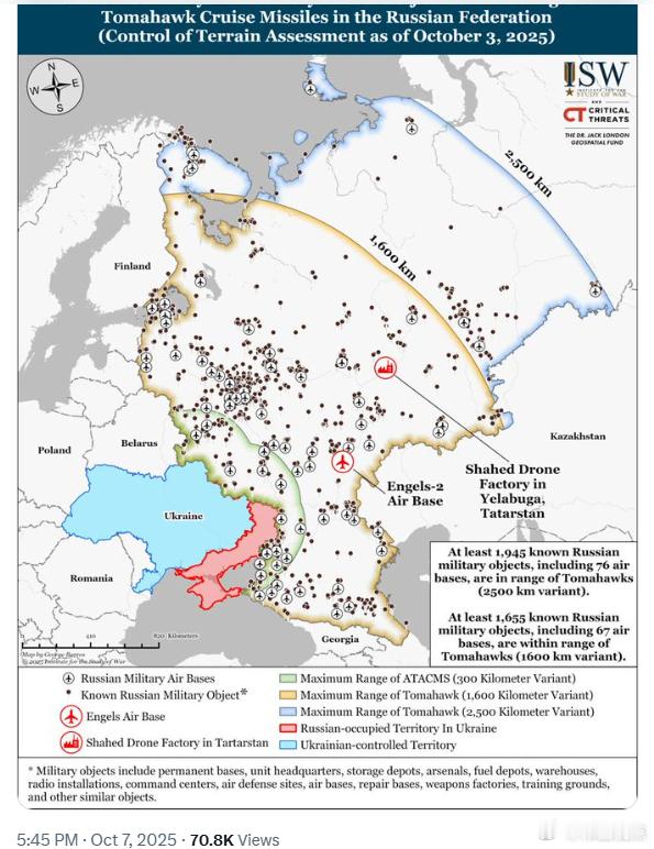 ISW估计,按“战斧”最低射程1600公里计算,至少有1655个俄罗斯军事目标在可打击范围内;若使用射程为2500公里的版本,这一数字将上升至1945个目标。