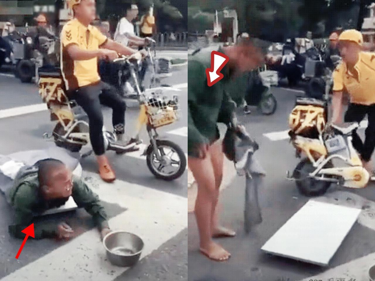 刷到这事儿,我真是又气又好笑。 没想到路边的残疾乞丐 , 可能不是残疾人! 小哥在斑马线等红灯,没留神压到了地上乞丐的裤子,那乞丐本来还在地上爬,这下急了使劲拽,结果“刺啦”一声裤子烂了——他居然“噌”地一下站起来了! 合着之前在地上趴半天,腿都是用衣服裹着装的残疾?平时大伙见着这样的,谁不心疼,路过总得给点零钱,想着帮衬下可怜人。 可这人倒好,有手有脚的,偏要装残疾骗同情,把别人的善良当赚钱的工具,尊严早就被他扔地上踩了。 我最膈应的不是他骗钱,是他毁了真正需要帮助的人的路。 以后大伙再看见路边的残疾人乞丐,心里难免会犯嘀咕:这是不是又是装的?最后倒霉的,是那些真走不动路、只能靠乞讨活下去的人!乞丐街头乞讨 残疾人