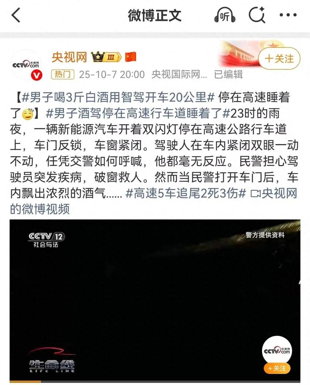 据央视网官方微博10月7日晚上8时许报道,23时的雨夜,一辆新能源汽车开着双闪灯停在浙江杭州的一条高速公路行车道上,车门反锁,车窗紧闭。驾驶人在车内紧闭双眼一动不动,任凭交警如何呼喊,他都毫无反应。民警担心驾驶员突发疾病,破窗救人。然而当民警打开车门后,车内飘出浓烈的酒气。男子告诉交警,他连续喝了两场酒,一共约3斤白酒。此事引起网友热议。