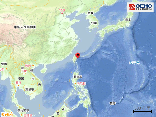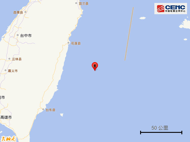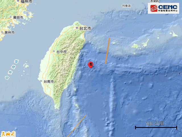 据中国地震台网正式测定,10月8日11时33分在台湾花莲县海域发生4.1级地震,震源深度10公里,震中位于北纬23.47度,东经122.11度,距台湾岛约60公里。