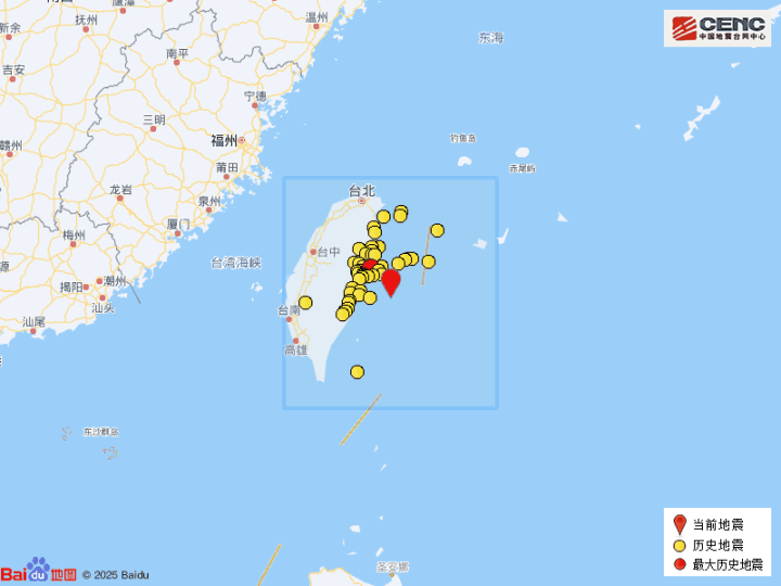 历史地震:根据中国地震台网速报目录,震中周边200公里内近5年来发生4级以上地震共378次,最大地震是2024年4月3日在台湾花莲县海域发生的7.3级地震(距离本次震中53公里),按震级大小前50次历史地震分布如图。