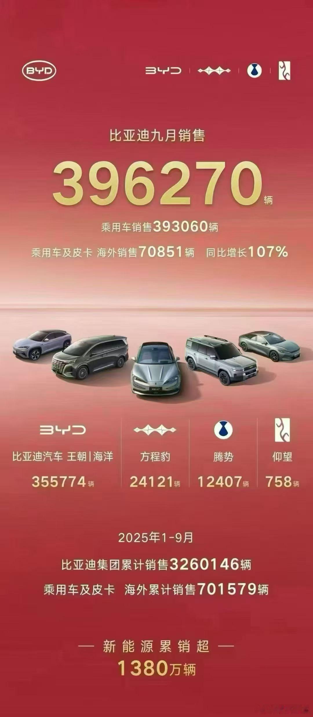 这意味着,比亚迪从2024年第四季度到2025年第三季度,已连续四个季度在全球纯电销量上领先特斯拉,成为全球新能源市场当之无愧的领头羊。2025年前三季度,比亚迪新能源汽车(NEV)整体销量达326万台,纯电车型贡献核心份额,占比49.26%,销量近160.6万台。