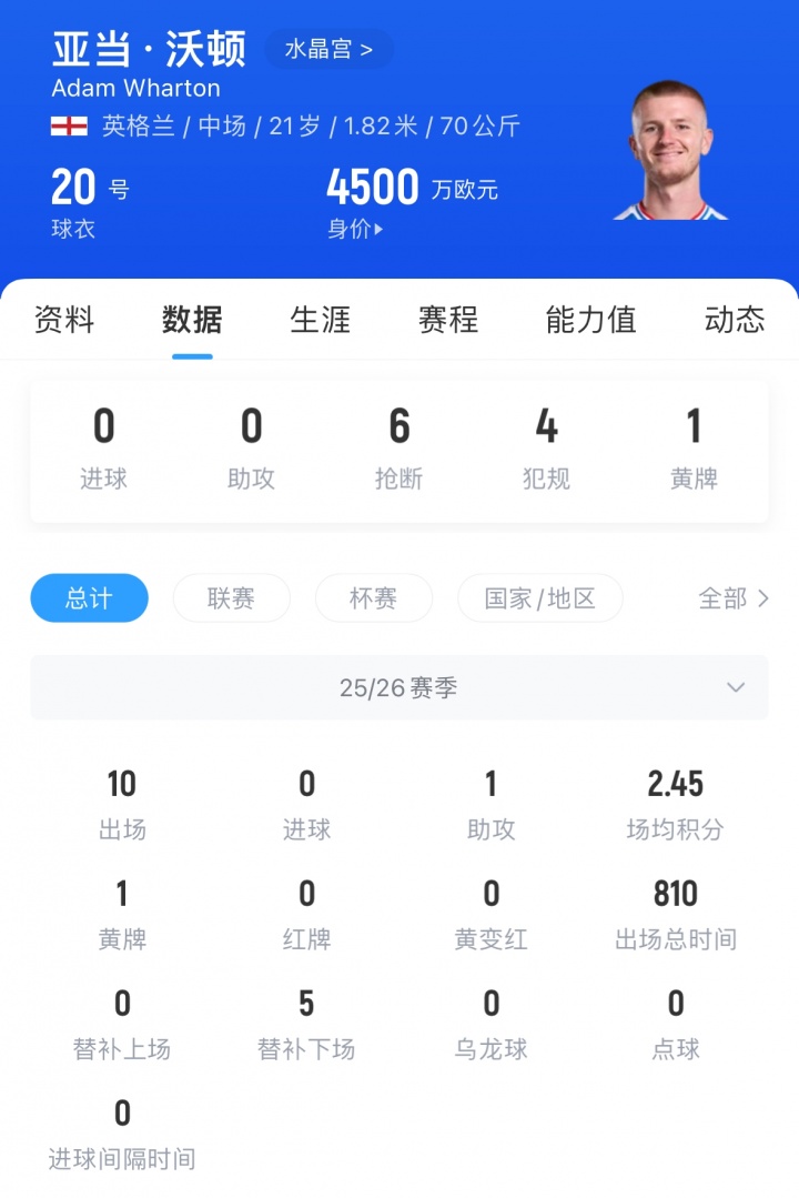 21岁的沃顿本赛季代表球队出场10次,贡献1助,目前德转身价为4500万欧元。