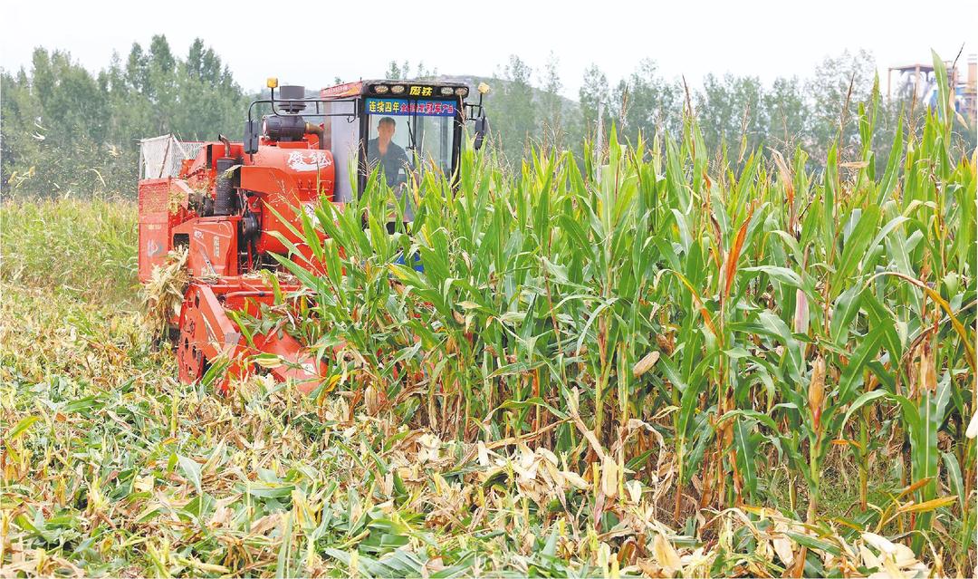 10月7日,枣庄市市中区孟庄镇焦庄村,村民使用联合收割机收获玉米。