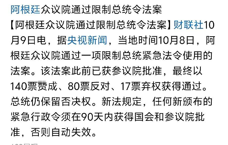 就在刚刚! 阿根廷总统米莱得到了一个“紧箍咒”! 阿根廷众议院通过限制总统法令案!以后,可不能由着性子任总统想一出是一出了,总是对法令紧急修改了! 不过,这次对米莱的打击可不小,激进改革严重受阻!