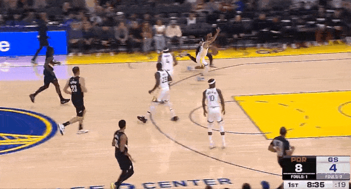 第一节比赛,卡马拉连中两记三分,开拓者开局11-4领先勇士。