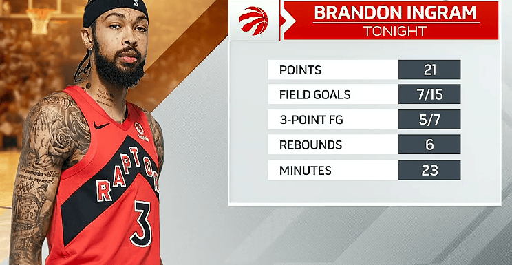 猛龙球员布兰登-英格拉姆出战23分钟,投篮15中7、三分7中5砍下21分6篮板3助攻。