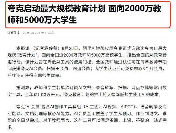 没想到还得是夸克,降低AI工具的使用门槛,这对国内教育领域绝对是好事一件![灵光一闪] 虽然现在AI在我们生活中的应用已经很普遍了,但是对于很多普通人来说,使用门槛依旧很高。但是夸克最近却做了一件让人意外的事儿,那就是推出全面的AI教育普惠行动,降低AI工具的使用门槛。 现在教育数字化是大势所趋,包括国家也在实施相关战略,夸克这么做无疑是有积极意义的。看看这次夸克的教育计划,符合条件的用户可以直接领取三个月夸克全端会员,其中扫描王、夸克网盘这两个常用工具就不用说了,在学生、教师等群体的使用率很高。 还有夸克AI会员也很强大,像AI生图、AIPPT、文档处理等核心AI能力在实际场景中是非常使实用的。不管是高校学生的调研、预习等需求还是教师、备课、批改作业,AI会员通通能够满足。 不仅如此,这个教育计划覆盖的师生数量也非常庞大,是面向线下全国近2000万教师和5000万高校学生,也就是说国内的高校师生群体都在计划当中了。 显然,夸克上线这个教育计划是真正想做点事儿的,毕竟过去一些平台将教育资源过度营销的做法,越来越不对味了。 所以夸克选择回归教育本质,不搞套路、降低门槛,这个教育计划也不是一天两天,而是不限时、不限量,一直坚持下去。 再高大上的技术,只有发挥出价值,造福更多的人,这样才有意义,这也是夸克推动AI教育普惠计划的初心,我们也相信夸克能给国内教育带来一些好的改变。