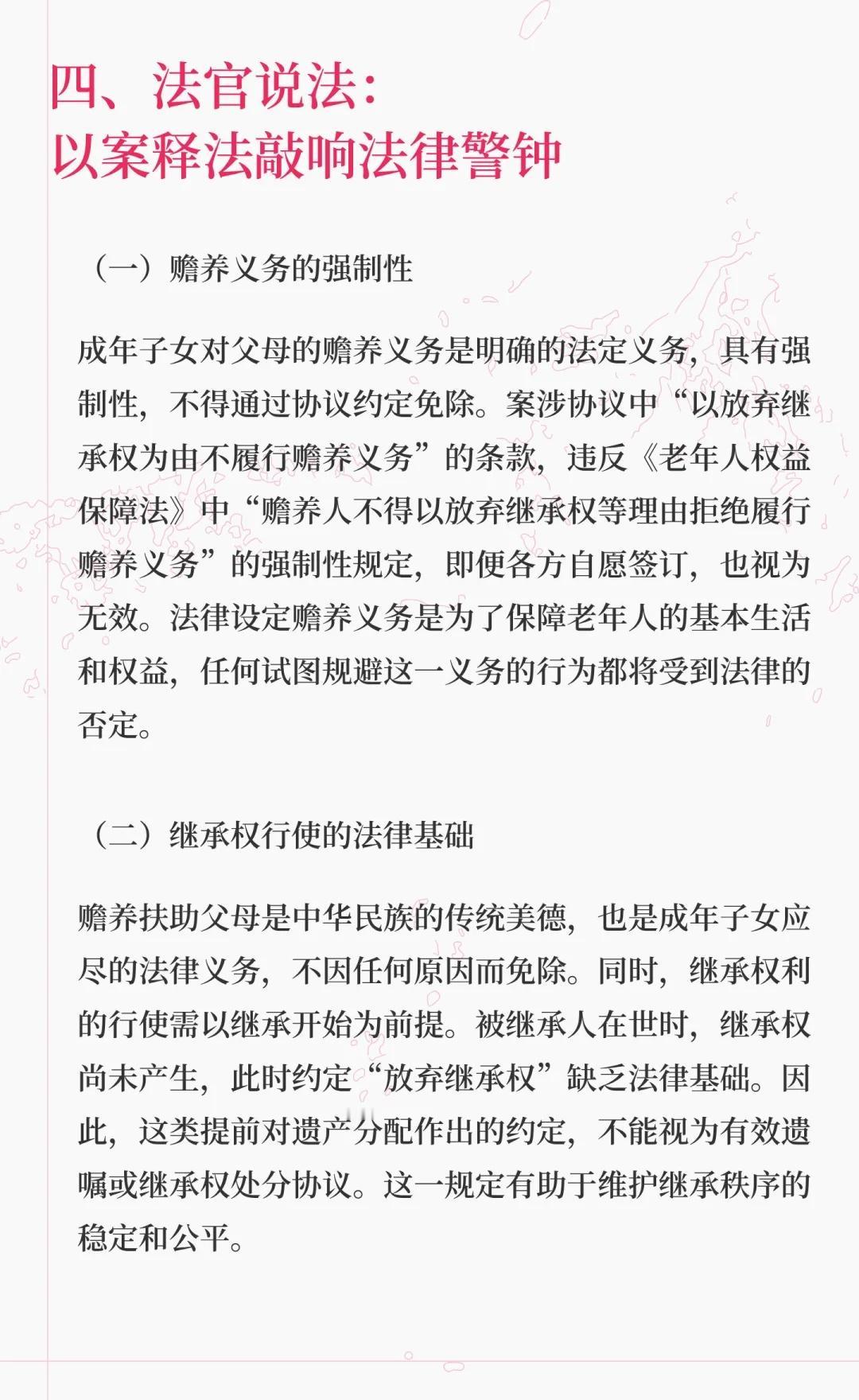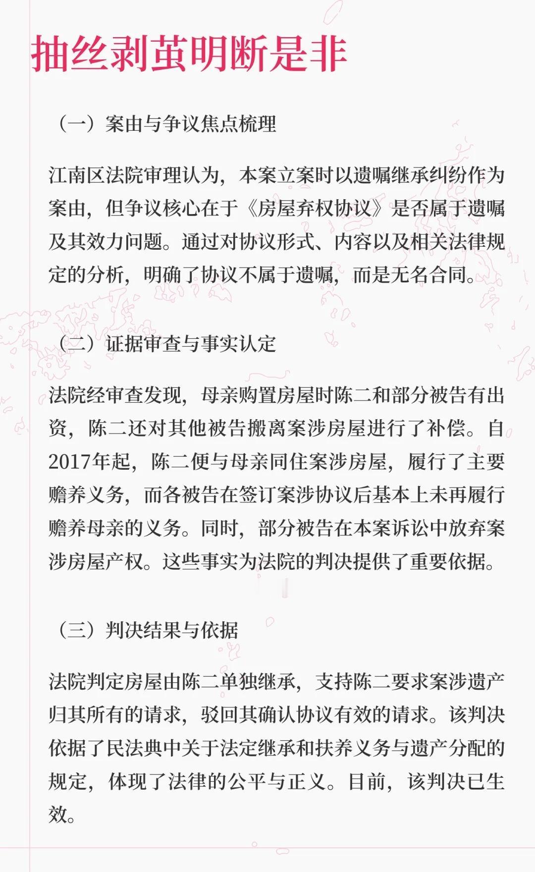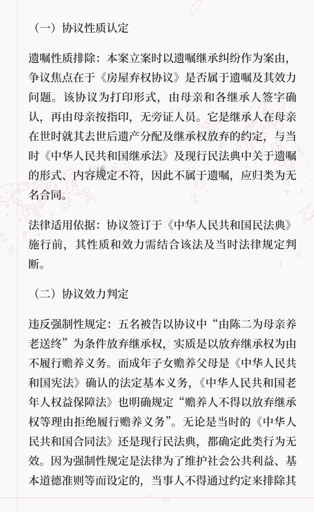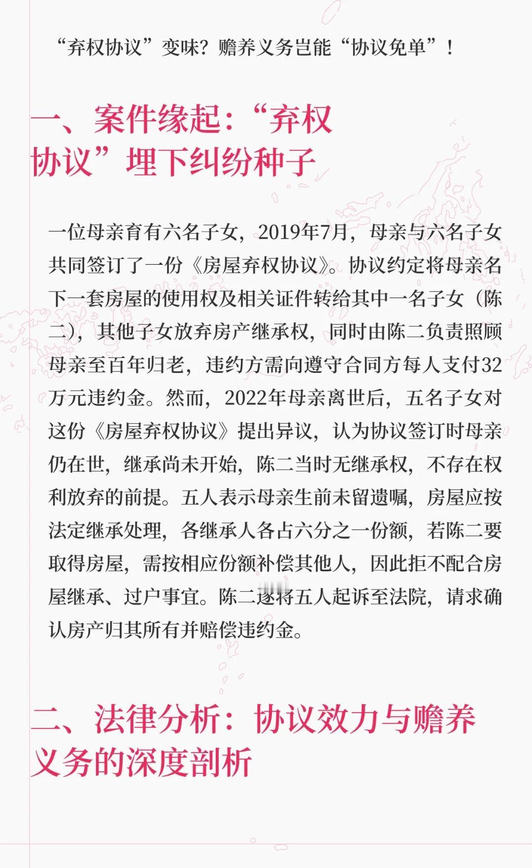“弃权协议”变味?赡养义务岂能“协议免单”! 母亲与子女签订《房屋弃权协议》,约定子女放弃继承权并赡养母亲,母亲离世后子女反悔,认为协议无效。法院认定协议无效,房屋由赡养母亲的陈二单独继承,其他子女需补偿。此案强调赡养义务不可免除,遗产分配需依法进行。 法律服务 律师咨询 律师 北京律师 法律咨询 继承权 放弃继承权 继承纠纷 继承纠纷
