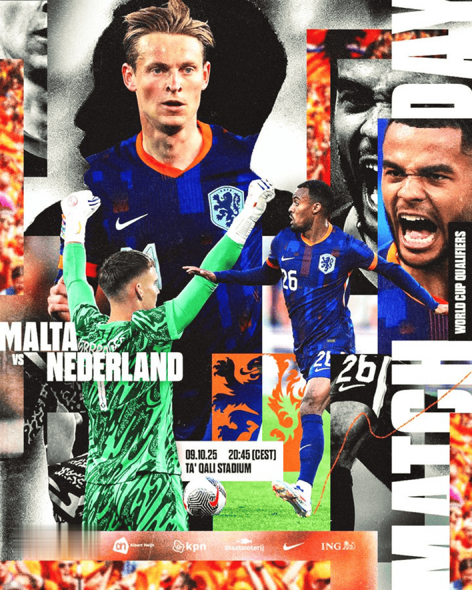荷兰发布世预赛对阵马耳他的预热海报,德容、加克波出镜