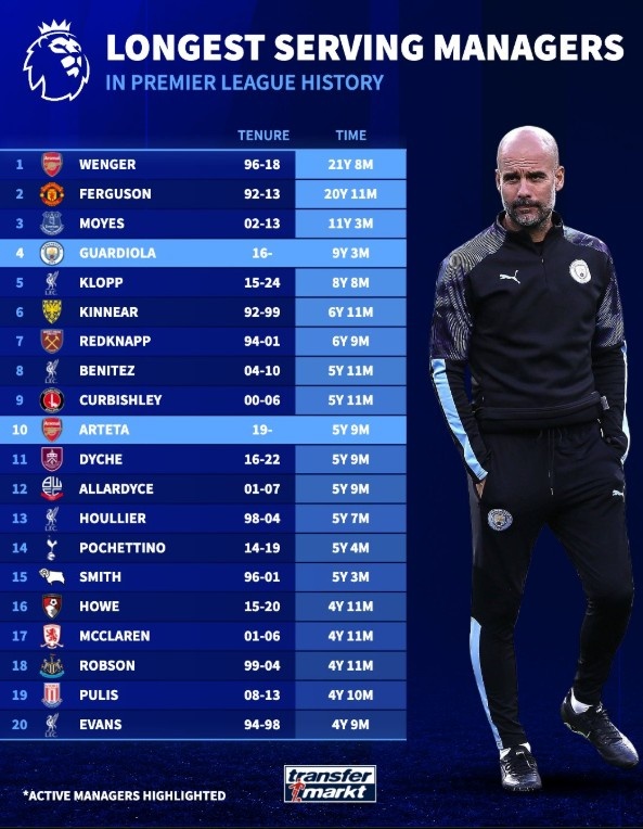 附英超历史主帅任职时长榜: