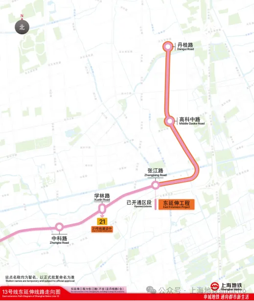 13号线东延伸自13号线张江路站(不含)向东北延伸,设车站2座,全长约4.52公里。