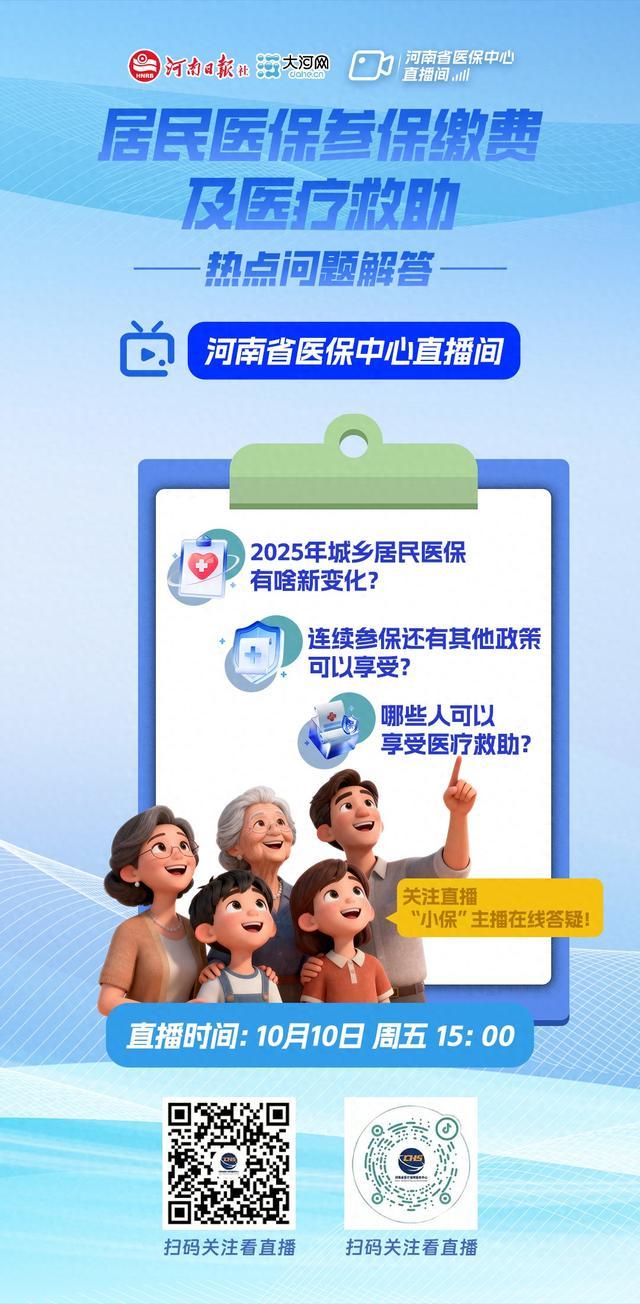 河南省医保中心将通过河南省医疗保障服务视频号、河南省医保中心抖音号、大河网全媒体等平台定期进行直播,如果大家有居民医保参保缴费及医疗救助相关问题,欢迎在直播间通过公屏参与互动,主播将实时为大家解答。(孙振恒)