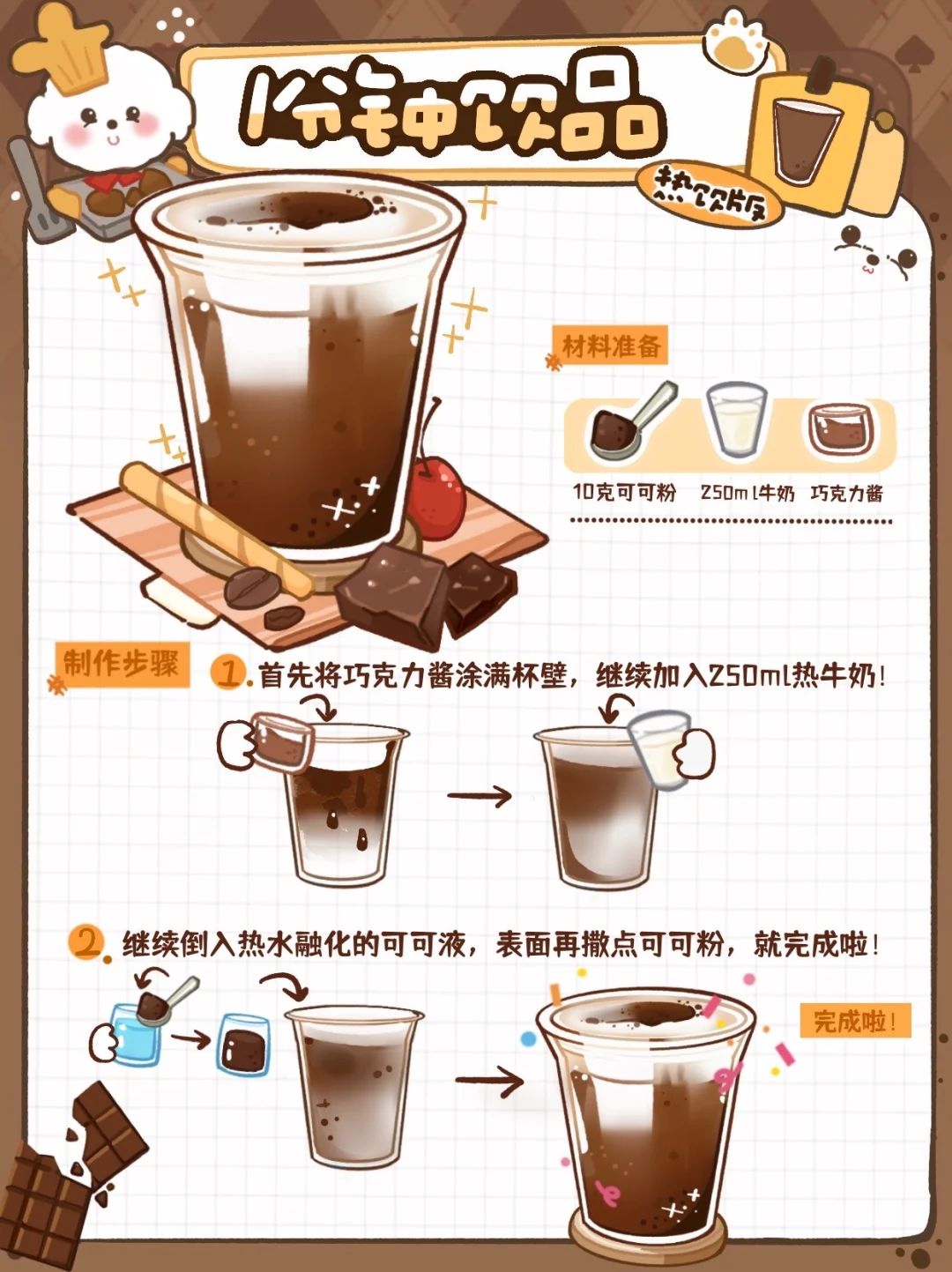 材料:10g可可粉+250ml热牛奶+巧克力酱