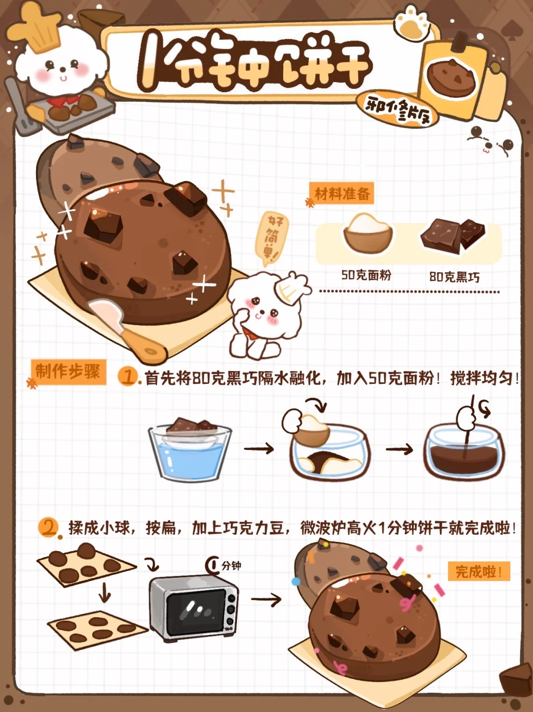 步骤:黑巧隔水融化+面粉搅匀→揉成小球按扁+巧克力豆→微波炉高火1分钟!