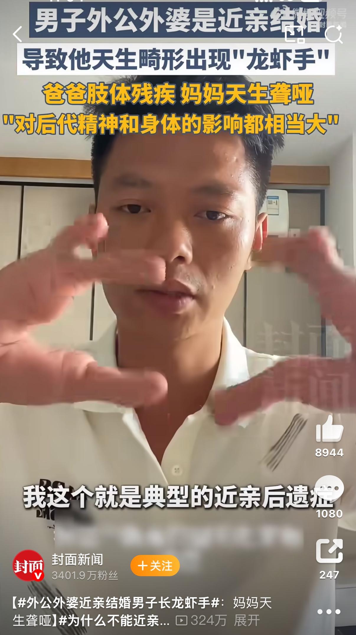 湖南那位90后小伙摊开自己双手的视频,真的让人一眼就心头一紧。他的双手双脚指头都紧紧并在一起,看起来就像龙虾的钳子,拿笔写字、系鞋带这些普通人随手就做的事,他得花上好几倍的力气才能完成。而这一切的源头,竟然是他外公外婆当年的决定——他们是亲堂兄妹,属于法律明确禁止的近亲结婚,这份隐藏的基因风险,最终落到了第三代的他身上。更让人揪心的是,这个家早就被这种风险笼罩了:他的妈妈天生聋哑,爸爸也有肢体残疾,一家人都在承受着不该有的苦难。 说真的,每次看到这种事都忍不住叹气,这哪是一家人的遭遇,分明是前辈一个错误决定引发的连锁悲剧。有人可能觉得“亲上加亲”是传统,可传统要是违背了科学,代价就是后代的一生啊。科学早就说得明明白白,近亲结婚的人携带相同隐性致病基因的概率特别高,这些基因碰到一起,就容易生出有问题的孩子。数据显示,他们后代患遗传病的概率是普通夫妻的150倍,像先天性心脏病、聋哑、畸形这些毛病,出现的几率会大大增加。 最让人难过的是,承担后果的往往是那些没选择权的孩子。小伙说他小时候总问老天爷,为什么自己和别人不一样,看着同学在操场打球、轻松写字,他心里又羡慕又难受。这种从童年就伴随的自卑和无奈,不是一句“坚强点”就能化解的。可他后来还能说出“理解父母”,这份懂事背后藏着多少委屈啊。这根本不是“命不好”,而是本可以避免的人为悲剧,就因为老一辈的观念或者无知,让后辈要花一辈子来买单。 更值得警惕的是,现在居然还有人觉得近亲结婚没什么,甚至抱着“肥水不流外人田”的想法促成这种事。我国《民法典》早就禁止直系血亲和三代以内旁系血亲结婚了,这么规定不是没道理的,就是为了挡住这种看得见的风险。那些觉得“身边近亲结婚也没出事”的人,其实是在赌运气,可生命哪能用来赌?就像网友说的,这毛病可能隔代才爆发,就是颗埋在家族里的定时炸弹。 这个小伙的故事不是个例,网上好多人都分享过类似的事:有的村里近亲结婚的夫妻,孩子走路一瘸一拐;有的家庭孩子天生聋哑,一辈子活在无声世界里。这些悲剧反复提醒我们,婚姻从来不是两个人的事,更是对下一代的责任。 真希望这个小伙的经历能叫醒更多人,打破那些落后的观念。你身边有没有听过类似的事?对于怎么避免这种悲剧,你还有什么想说的? 来源:封面新闻