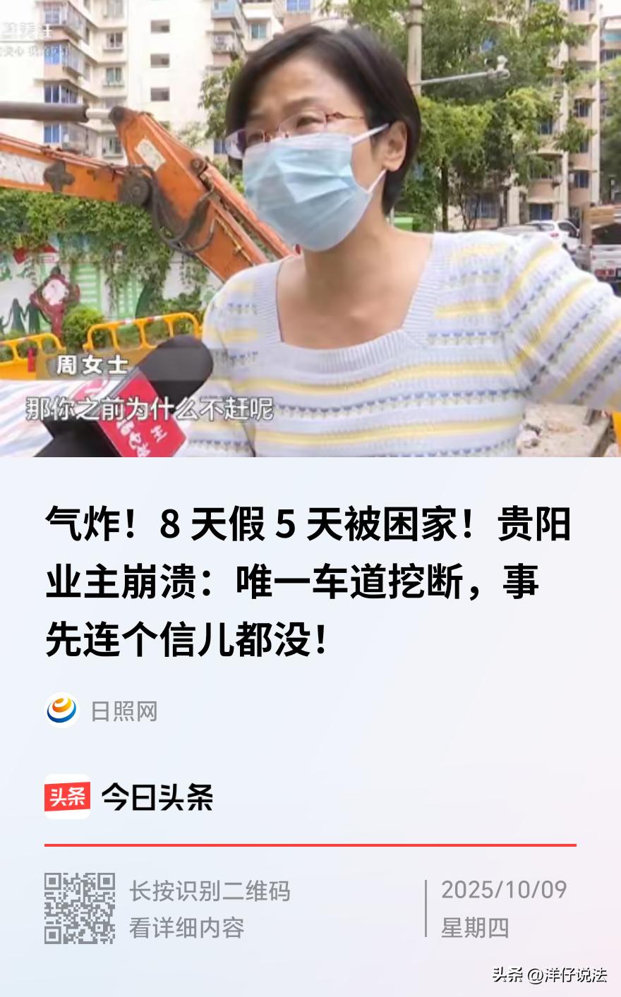 贵阳,一女子早早就规划好了国庆假期,特意买了游乐园门票准备带孩子好好玩玩,不料,女子国庆第一天推开窗看到楼下唯一进出小区的车道被挖开一条两米宽的大沟,黄泥土堆成半米高的小山,整个路面彻底断了,车子被困在车位里动弹不得。孩子趴在窗边一遍遍问:“妈妈,我们什么时候去游乐园?”女子急得团团转,找施工队理论,对方甩下一句“等通知”就没了人影。找物业,物业双手一摊:“我们也没办法。”整整五天,女子眼看着朋友圈里都是出游照片,孩子整天闷在家里无精打采。女子无奈找记者介入,施工方才连夜回填土方,车是开出来了,可好好的假期也毁了。 据日照网10月8日报道,周梅是一名上班族,平时工作忙碌,难得有长假可以陪家人,这次国庆假期,周梅早早就计划打算带着孩子去周边的公园和游乐场玩,享受亲子时光。 10月1日早上,周梅起床后,习惯性地从窗户往外看,想检查一下天气和小区情况。 没想到,小区唯一的车辆进出口被挖开了一条大沟,黄泥土堆得像小山一样高,把路面堵得严严实实。 周梅顿时懵了,前一天晚上,她停车时还好好的,怎么一觉醒来,路就没了?她赶紧下楼查看,只见几个工人在现场施工,但问起什么时候能修好,工人支支吾吾地说“可能要三天”。 周梅心里一沉:三天?那她的假期计划不全泡汤了? 更让她崩溃的是,从10月1日到5日,整整五天,她的车都被困在小区里,动弹不得,原本计划好的亲子游被迫取消,孩子整天闷在家里,抱怨连连。 周梅试图联系物业和施工方,但得到的回复总是推诿和含糊。 这期间,施工队甚至有时不见人影,工程进度慢得让人着急,周梅算了一笔账:假期一共8天,5天被困,剩下的时间也所剩无几。 周梅买的游乐园门票只能作废,经济损失不说,对小孩的心里伤害也是很大的。 10月5日,周梅找记者赶到现场时,看到了那份贴在墙上的公告,上面写着竣工日期是今年7月,可现在是10月,工程延期了整整三个月! 周梅气愤地说:“延期施工咱先不说,关键是开工前连个通知都没有。要是提前说了,我把车停到外面去,也不至于被困成这样啊!” 物业方面对记者说:“施工方就通过街道跟我们打了声招呼,让配合一下,至于每天在哪施工、啥时候开工,全是他们自己说了算。” 当被问及为什么不通知居民时,物业直接说:“没法通知”。 施工方在记者介入后终于露面,但一看到镜头就躲闪,不让拍摄,他们的解释称:“我们施工前都按车上的电话通知车主了,肯定是她自己在通知之后才把车停进来的,这能怪我们吗?”还说施工慢是因为在等检测结果。 周梅当场反驳:“我车一直停在小区里没动过,啥时候收到过通知?你们这是把责任往我身上推啊!” 经过记者调解,施工方才同意先回填部分路段,让车辆能临时通行。 那么,从法律角度,周梅的遭遇该如何评价呢? 1、施工方未提前通知,侵犯了周梅作为小区业主的知情权及基本通行权益。 《民法典》第一千一百六十五条规定,行为人因过错侵害他人民事权益造成损害的,应当承担侵权责任。 业主周梅在小区有权利获得基本出行自由,除非法律规定外,任何单位及个人不得干预或影响周梅的通行权益。 施工方受托对小区道路施工,有义务提前通知小区业主,避免造成业主不合理的影响。 本案中,周梅女士的车辆因道路被挖而无法驶出,长达五天被困。这不仅打乱了其家庭出游计划,造成了预购门票等直接经济损失。 而但是,施工方声称按车上的电话通知了车主,但无法提供有效证据,且与业主周梅“从未收到通知”的陈述直接矛盾,该主张难以采信。 可见,施工方的行为涉嫌侵害周梅的合法权益。 2、物业公司未尽合理通知义务,对周梅的损失亦负有相应责任。 《民法典》第九百四十二条规定,物业服务人应当按照约定和物业的使用性质,妥善维修、养护、清洁、绿化和经营管理物业服务区域内的业主共有部分,维护物业服务区域内的基本秩序…… 维护小区“基本秩序”就包括了对进入小区进行可能影响业主正常生活的施工行为进行管理和协调。 物业公司职责绝非被动地“传声筒”,而是主动的“管理者”,在获知施工信息后,物业有义务向施工方核实施工范围、工期、影响及应急预案,在核实信息第一时间进行充分公示和提醒。 与此同时,物业也应该与施工方就施工时间、临时通行方案等进行协商,最大限度减少对业主的影响。 具体到本案,物业公司仅仅“知道有施工这回事”,但未采取任何上述积极措施。其“没法通知”的说法是完全站不住脚的。 接下来,周梅可以向主管部门投诉物业公司不履行法定职责的行为;向城市管理部门投诉施工方不规范施工、影响业主生活的问题。 此外,周梅也可以提起诉讼,向施工方及物业方主张赔礼道歉并赔偿损失。 对此,您怎么看?