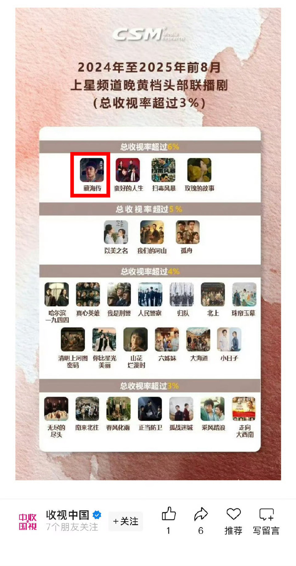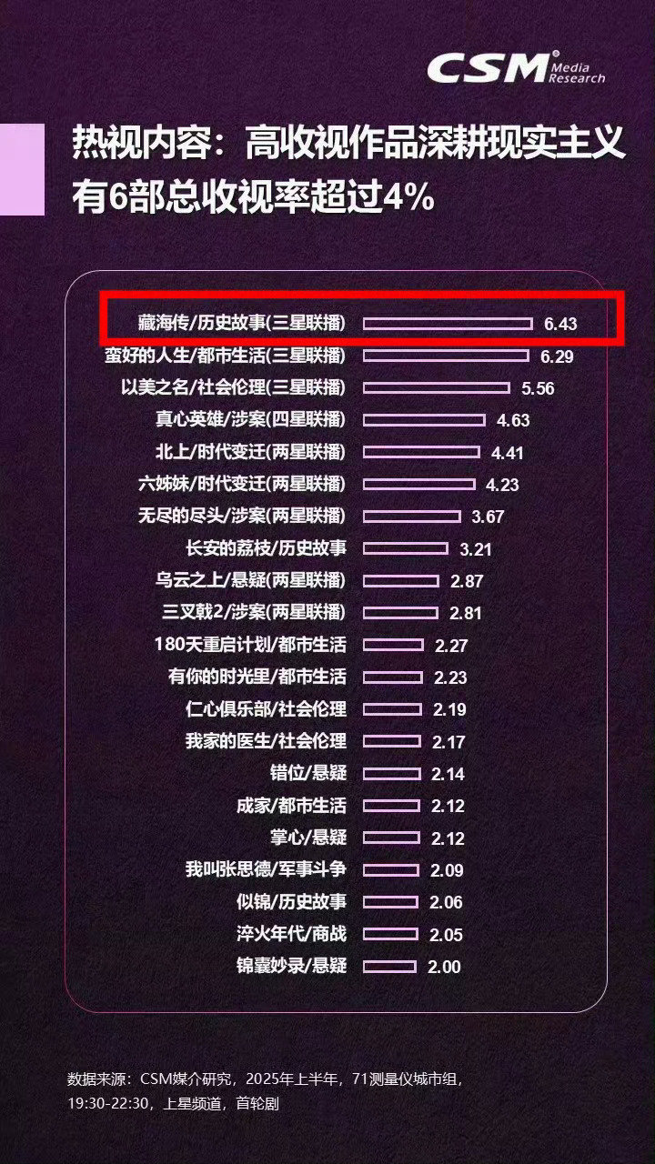 2025年《藏海传》以6.43%总收视率斩获上半年剧王,全媒体规模超过218亿人次。24年-25年8月近两年时间,仅有四部剧总收视率超过6%,《藏海传》位列第一。