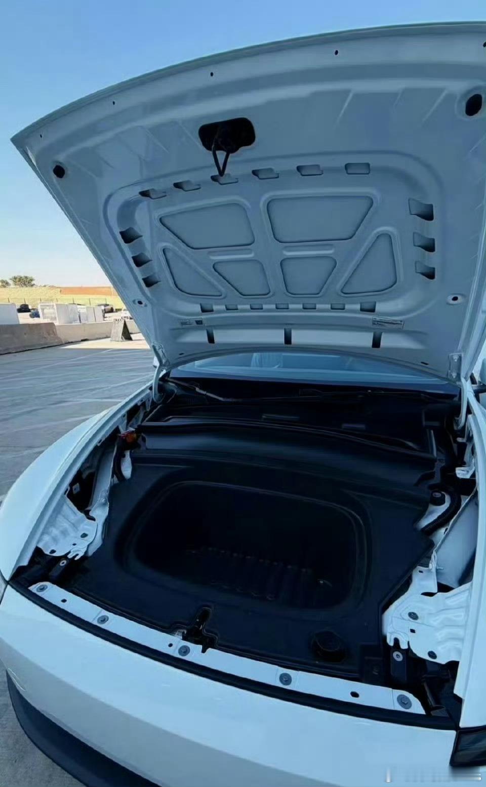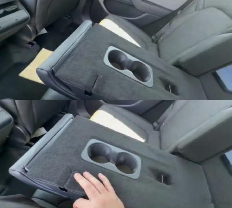 最搞笑的是前备箱换成了类似玻璃纤维的材质,但还留有不少非覆盖处,加上这个机盖,让打开前备箱成了一件「露骨」的事;后排杯架更是直接放到中间座椅的椅背上,让后排乘客放饮料时感受到一丝抽象。