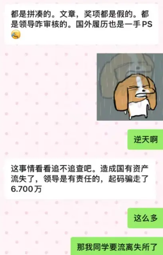 而之前此人在学校的宣传上很牛的,定位是科技领军人,不仅仅投入各种资源,而据该校的同学称,此人还准备参评中科院院士。而且学校给他的地位和待遇都很高,博导,副校长待遇。谁能想到费尽心思招过来的人是个骗子。