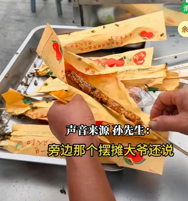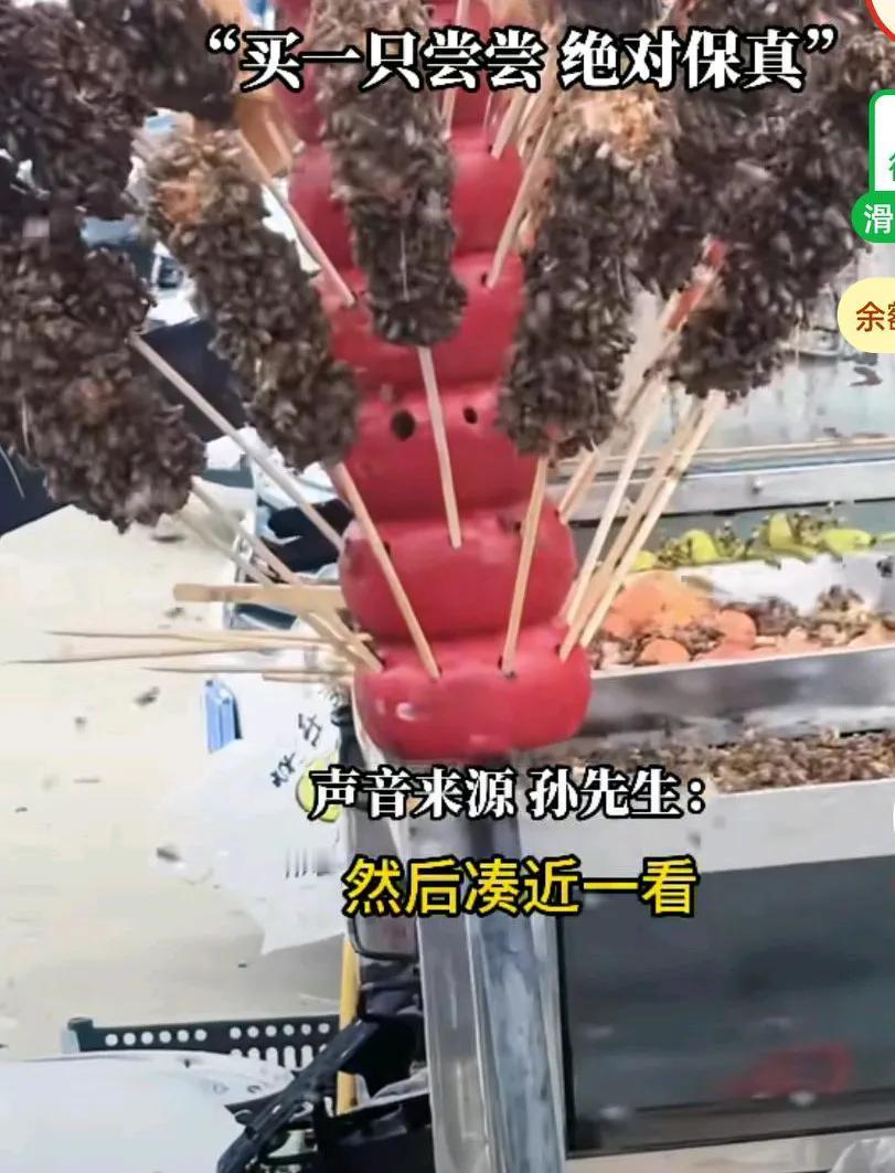 景区门口售卖的糖葫芦上爬满蜜蜂,淡定大爷坐等懂行顾客购买,男子说离远一看, 以为糖葫芦上都是虫子, 可能是各种蚊蝇之类的, 走近一看都是蜜蜂, 旁边的大爷说买一个尝尝吧,这保准是真的, 因为干的时间比较长了, 已经习惯了蜜蜂都过来偷吃了, 可能蜜蜂以为这是花蜜, 都过来采蜜了。 看来大爷的糖葫芦是货真价实的蜜制糖葫芦。 不过这买回一只糖葫芦, 带着一窝蜂,这也不敢吃呀, 只可远观不可亵玩焉,近处也不敢买呀,这怎么吃呀, 虽然保真,但无处下口。
