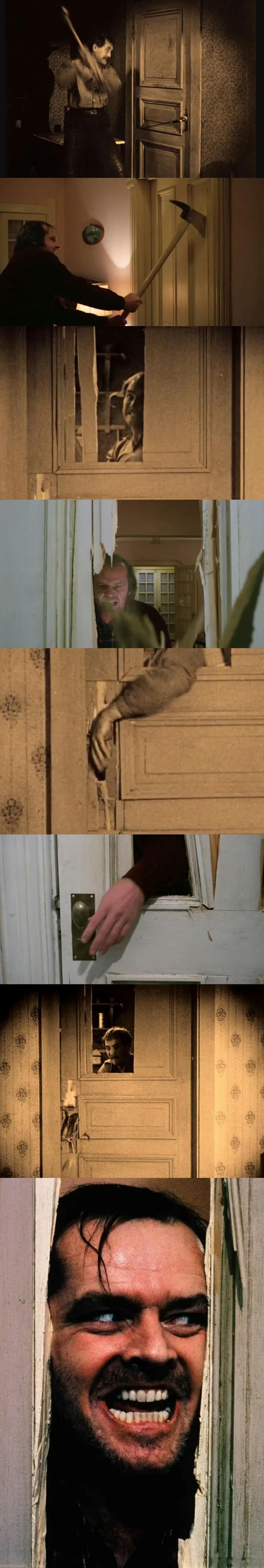 尤其是男主被女主锁在厨房,男主用斧头劈门的那段平行蒙太奇,让紧张的氛围感极其浓烈,怪不得连库布里克都要模仿。