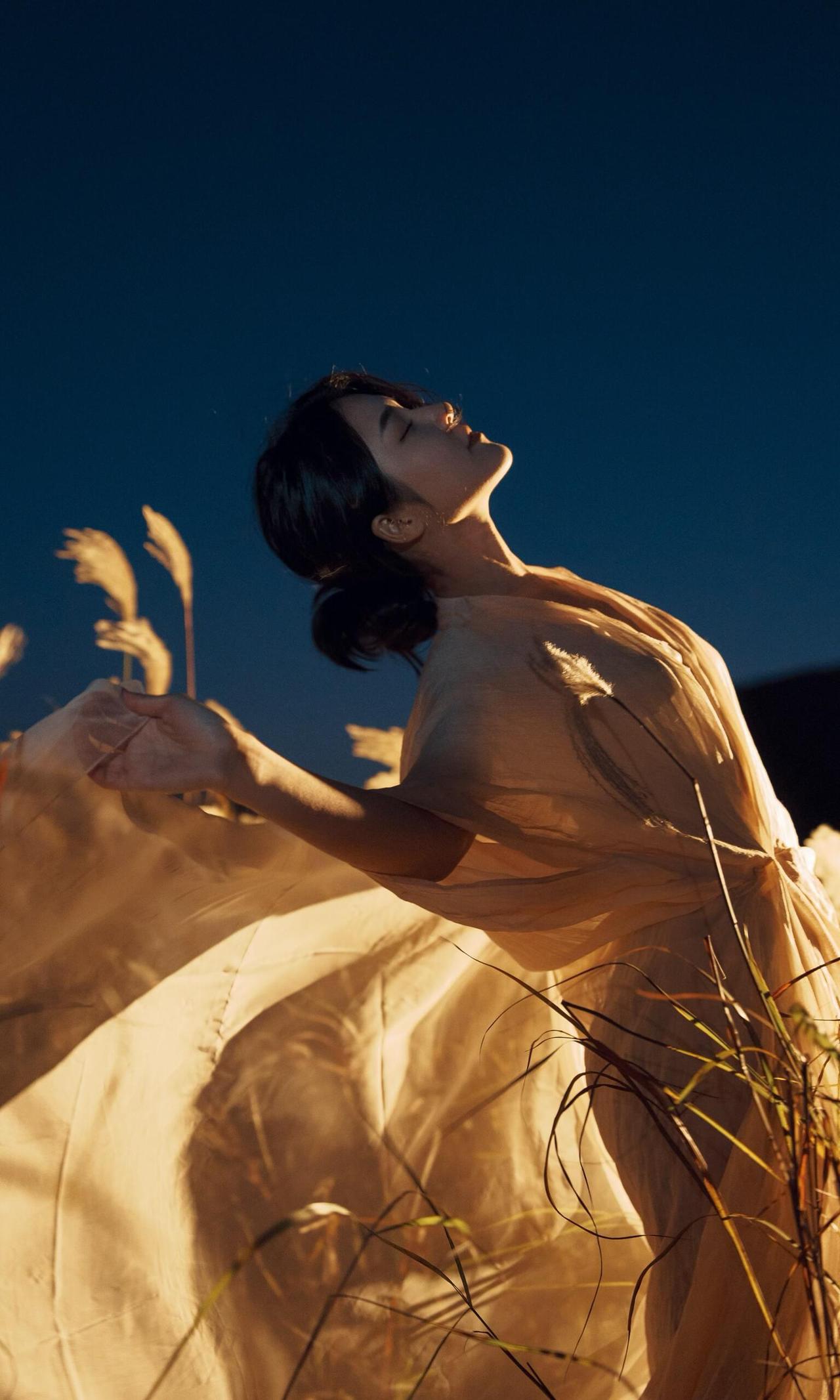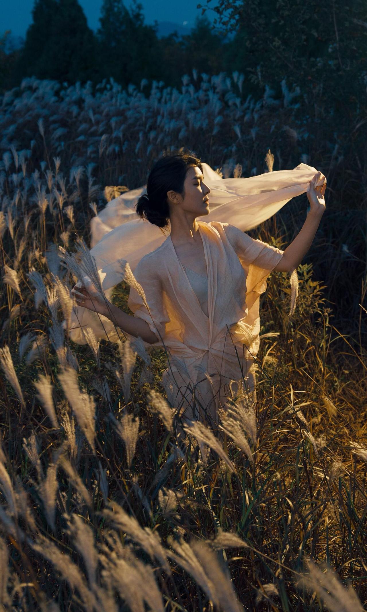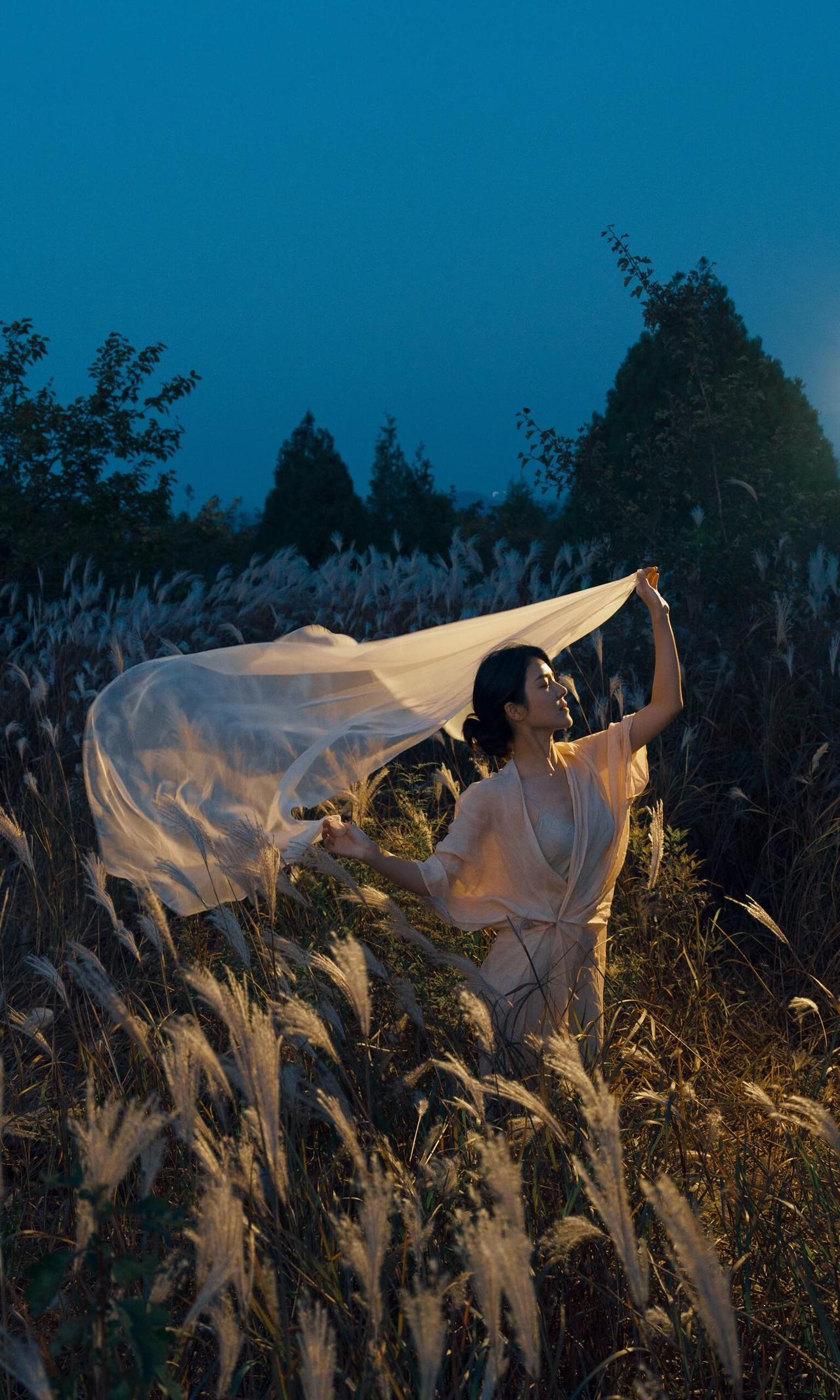 从元素构成看,芦苇的蓬松质感、纱裙的飘逸形态与渐变天空的澄澈感,三者形成材质与色彩的和谐共振。人物的姿态设计充满叙事性,或回眸凝望,或闭目沉醉,或舒展双臂,每一个动作都像是与芦苇、与风、与暮色的对话,让“人像”成为自然场景中抒情的诗行。 在技术表达上,光线的控制堪称精妙。黄昏时分的低角度光线被充分利用,通过精准的曝光让人物面部细节与背景的光影层次同时保留,避免了“剪影化”的单调。纱裙的半透明质感在光线穿透下呈现出丰富的纹理变化,这种“轻与重”“实与虚”的视觉对比,让画面层次愈发饱满。色彩搭配上,暖棕与暖橙的主调贯穿始终,却在不同画面中因光线强度呈现出微妙差异,这种差异让系列作品既有统一的风格标识,又有各自的情绪侧重——或温柔,或孤寂,或充满力量。