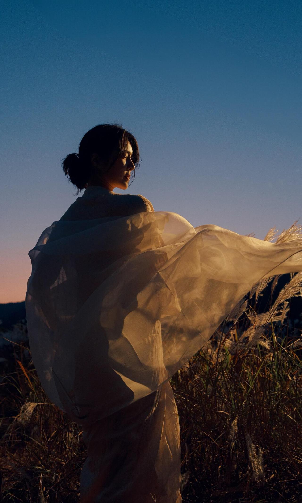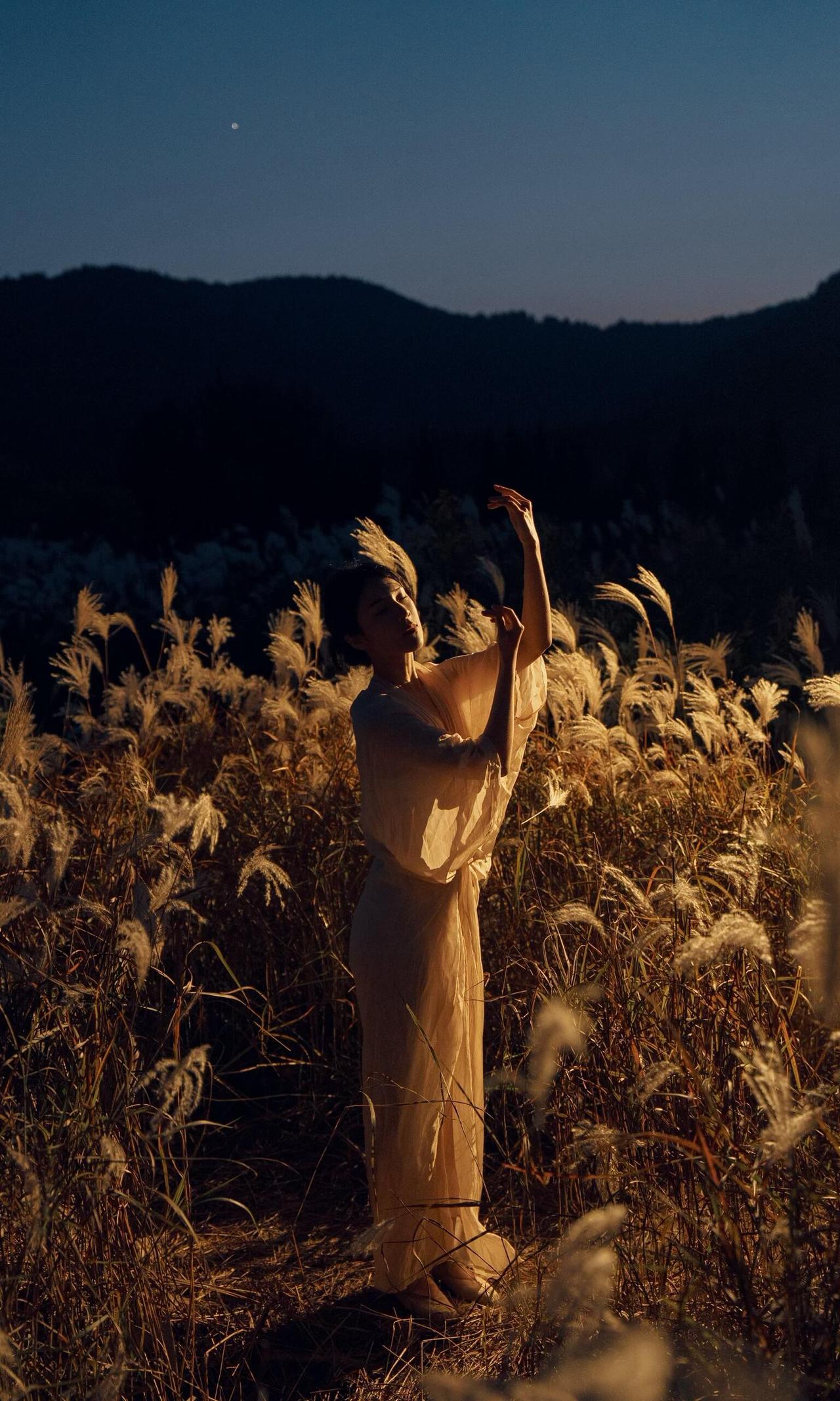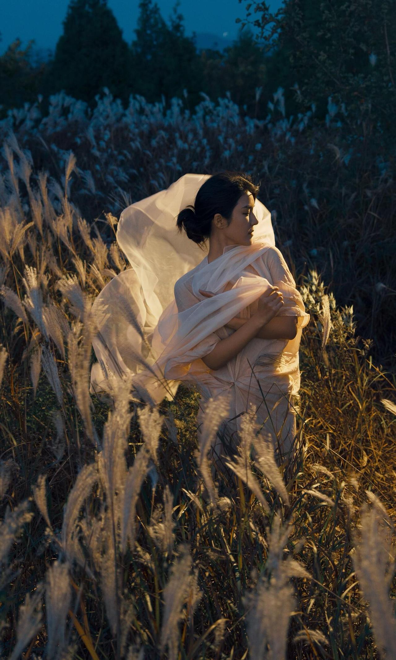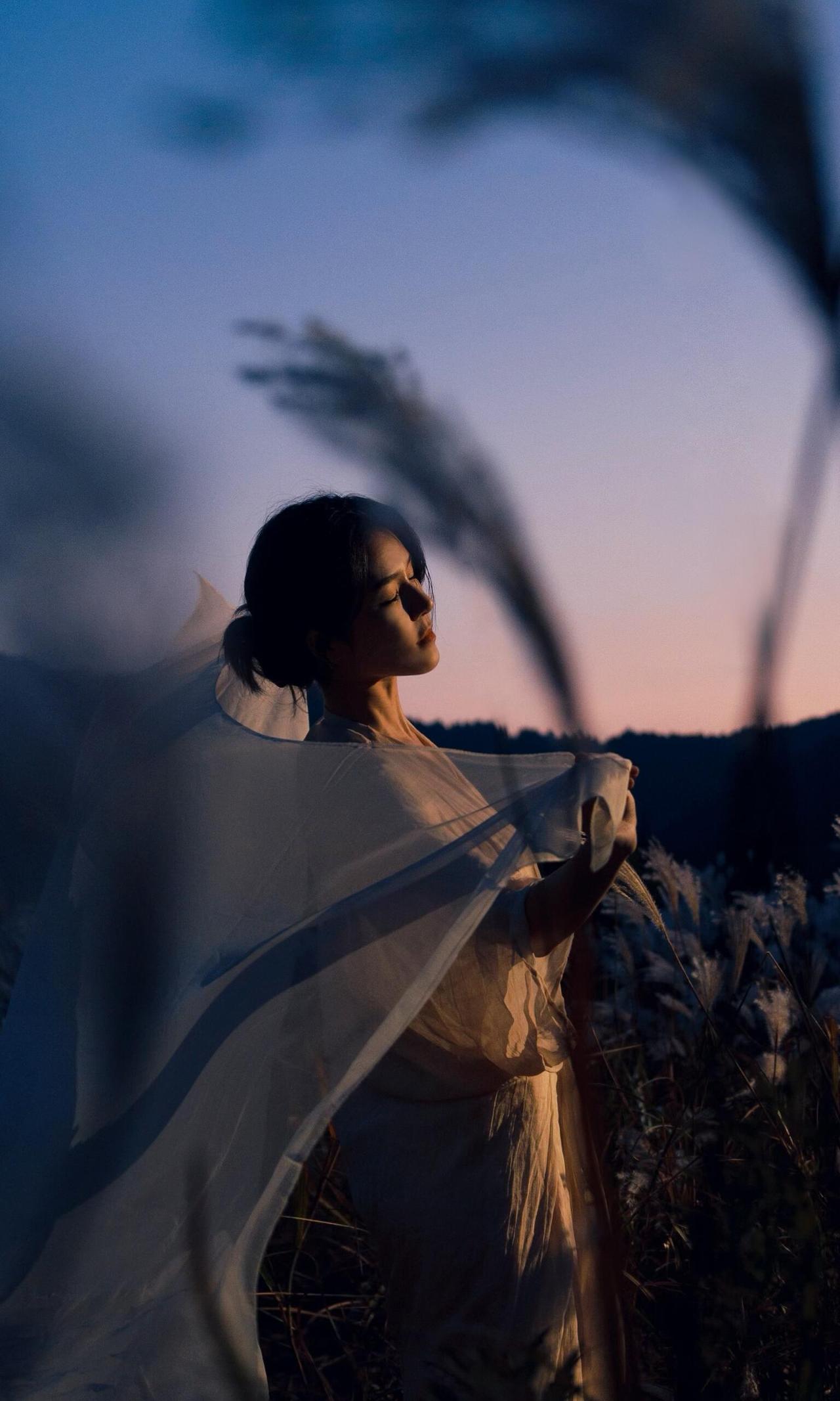 从元素构成看,芦苇的蓬松质感、纱裙的飘逸形态与渐变天空的澄澈感,三者形成材质与色彩的和谐共振。人物的姿态设计充满叙事性,或回眸凝望,或闭目沉醉,或舒展双臂,每一个动作都像是与芦苇、与风、与暮色的对话,让“人像”成为自然场景中抒情的诗行。 在技术表达上,光线的控制堪称精妙。黄昏时分的低角度光线被充分利用,通过精准的曝光让人物面部细节与背景的光影层次同时保留,避免了“剪影化”的单调。纱裙的半透明质感在光线穿透下呈现出丰富的纹理变化,这种“轻与重”“实与虚”的视觉对比,让画面层次愈发饱满。色彩搭配上,暖棕与暖橙的主调贯穿始终,却在不同画面中因光线强度呈现出微妙差异,这种差异让系列作品既有统一的风格标识,又有各自的情绪侧重——或温柔,或孤寂,或充满力量。