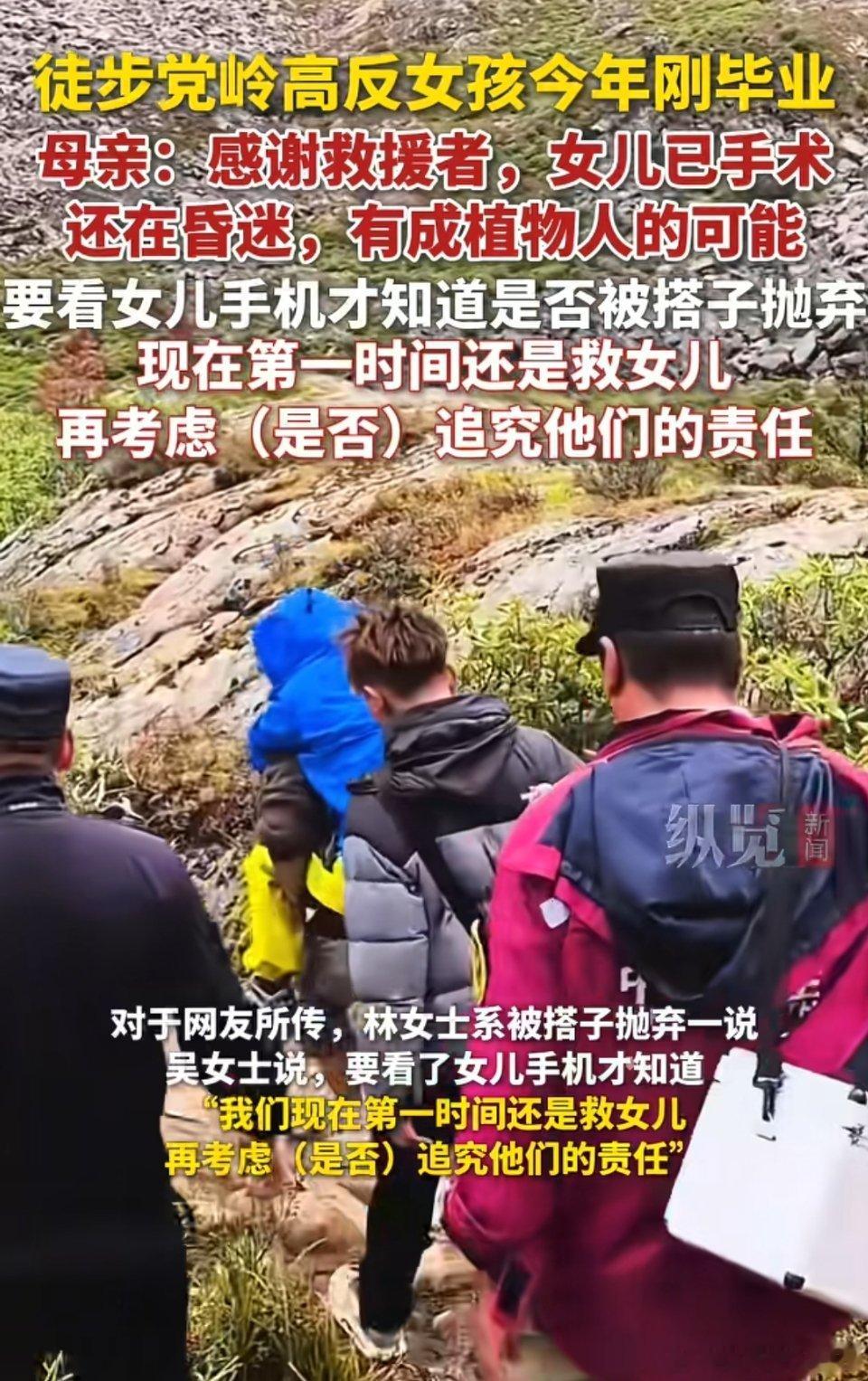 🔻一女孩昏迷在海拔4700米高山上,因严重高反和失温疑被搭子抛弃,另一支队伍发现后放弃行程紧急救援。母亲:感谢救援者,女儿已手术,还在昏迷,有成植物人的可能。