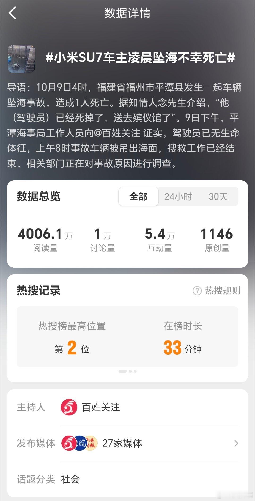 10月9日,据微博报道,福建福州平潭县发生一起令人痛心的车辆坠海事故,造成一名司机不幸身亡。随后,“小米SU7车主凌晨坠海身亡”这一话题迅速登上微博热搜,由主持,共有多达27家媒体参与传播,引发广泛关注。