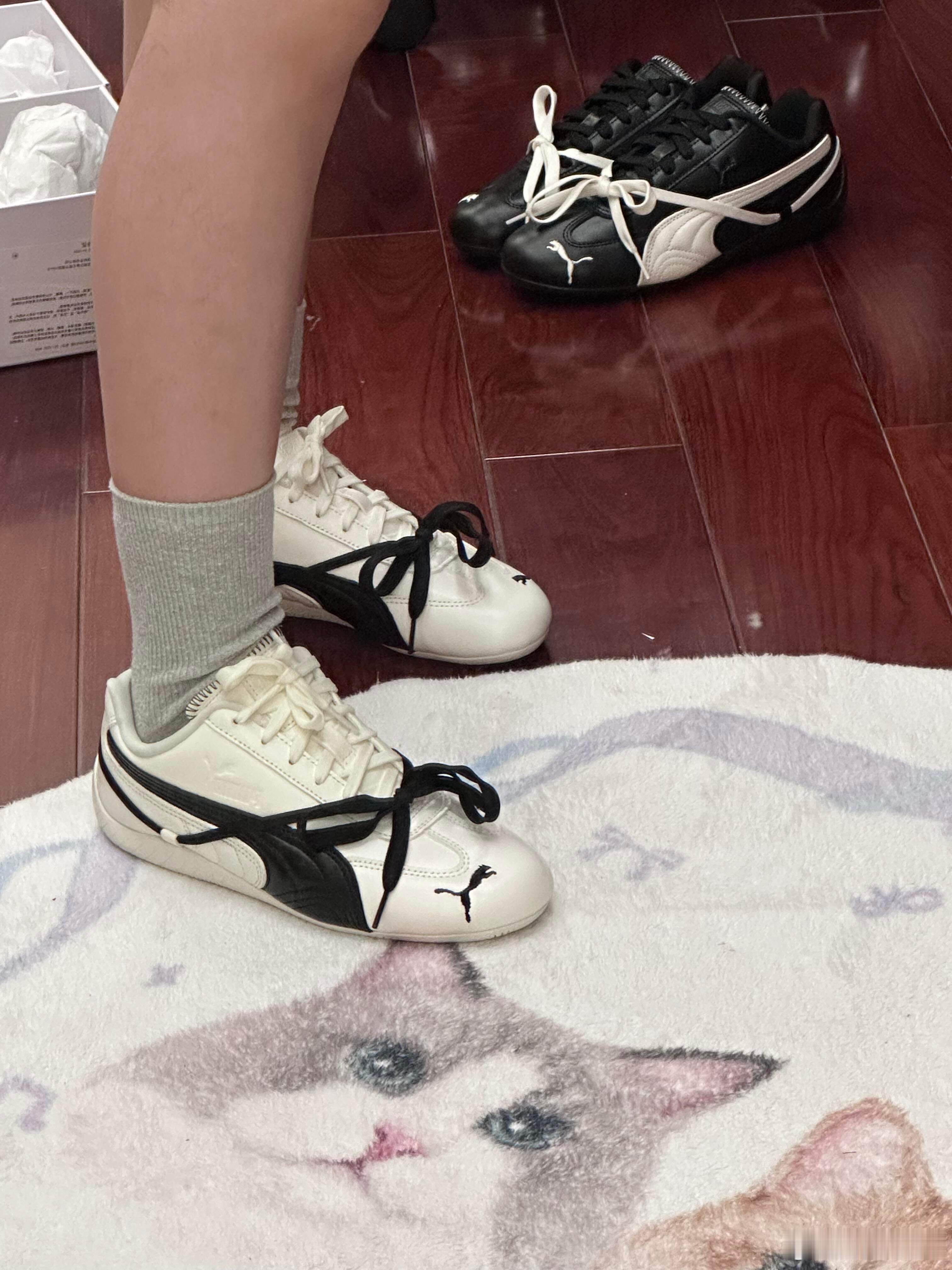 白色鞋带系成的蝴蝶结与浅灰色堆堆袜的搭配,为这身休闲造型注入了一丝轻松俏皮的活力。鞋子被置于红棕色木地板上,脚下柔软的猫咪图案地毯则平添了几分温馨的生活气息。整体画面聚焦于鞋款的日常实穿性,它完美融合了运动基因与街头时尚,无论是出街还是居家,都能轻松营造出舒适随性的穿搭风格,是一双兼具经典美学与生活情趣的百搭鞋款。时尚鞋履SOTD鞋控的日常