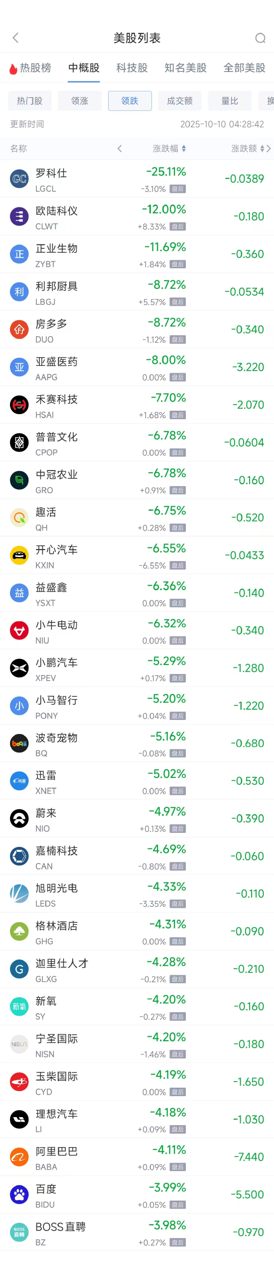 下跌股当中(按市值从高到低),台积电跌1.52%,阿里巴巴跌4.11%,拼多多跌1.88%,网易跌1.49%,京东跌2.89%,携程跌0.61%,百度跌3.99%,中华电信跌1.04%,日月光半导体跌1.26%,理想汽车跌4.18%,富途控股跌2.60%,小鹏汽车跌5.29%,贝壳跌0.76%,联电跌0.93%,蔚来跌4.97%,中通跌0.10%,满帮跌1.91%,住酒店集团跌0.95%,BOSS直聘跌3.98%,唯品会跌2.00%。