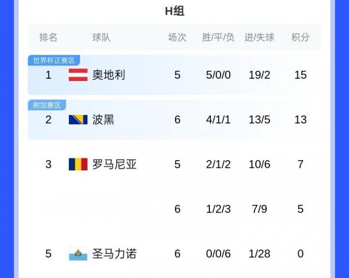 奥地利5连胜领跑H组,少赛一场领先波黑2分。圣马力诺6连败垫底,只进1球狂丢28球。