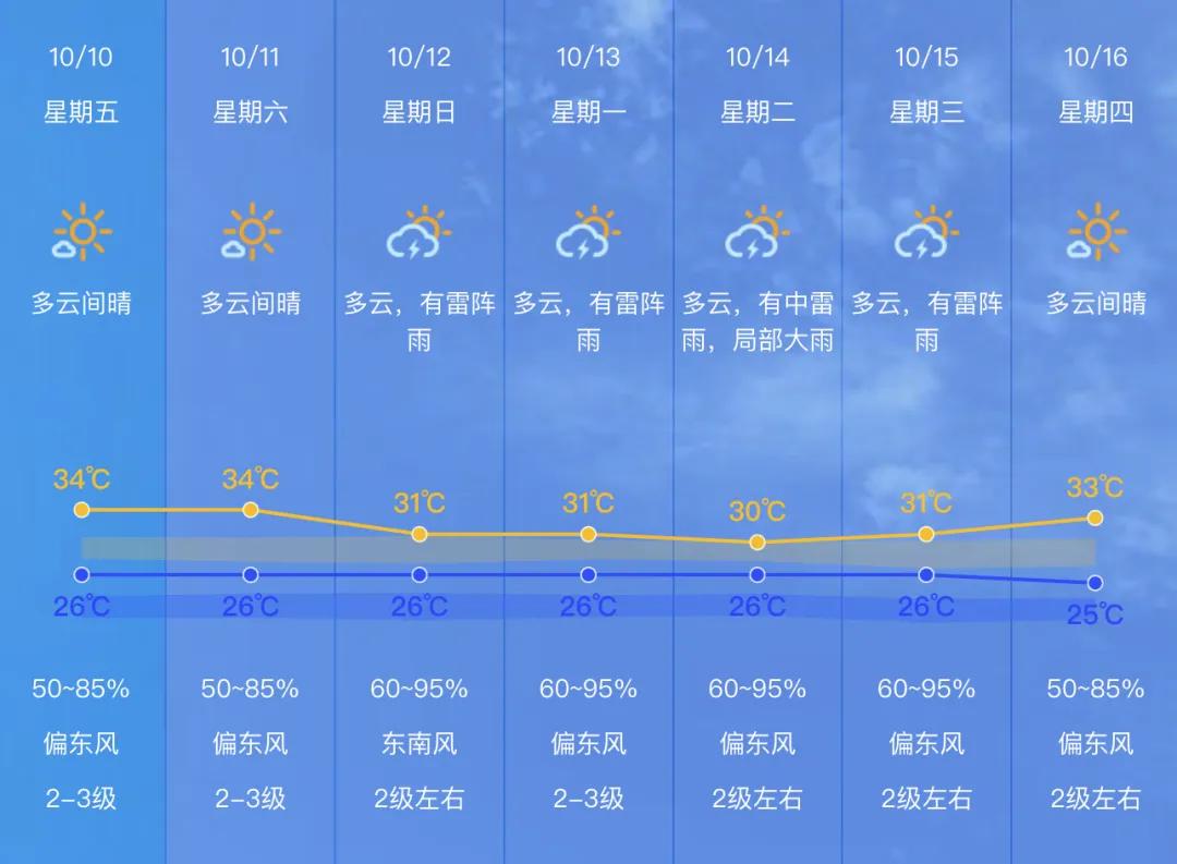预计10-11日我市以多云间晴为主,午间气温较高;展望12-15日受东南气流影响,我市云量增多,降水趋于明显。