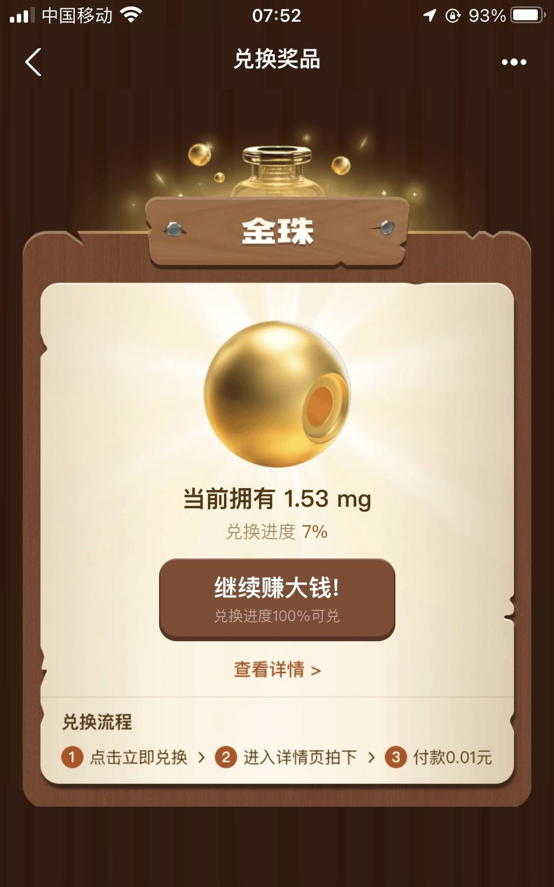今天的二级宠物蚌,又开出了幸运的“淡金皇后珠”,虽然只带来了704个养殖金,但相对于瑕疵白珍珠,那简直是天壤之别了吧! 一段时间的养蚌经验告诉我,开蚌,需要保持一颗平常心! 不管开到的是金珠、稀有珍珠,或者是普通的珠子,这些都是宠物蚌通过艰难的阵痛所带来的,我们应该敬畏和感恩! 我的小金珠瓶子里目前只有1.53mg,兑换进度也只有7%,但信心满满。放在一个较长的时间维度里,个人感觉,这个“金珠梦”,一定会实现的! 对面的友友,你的小金珠攒了多少了呢? 友情提示~ 养蚌纯属个人爱好,毫无推广等商业营销套路,如果你的生活节奏比较快,切勿盲目跟风!